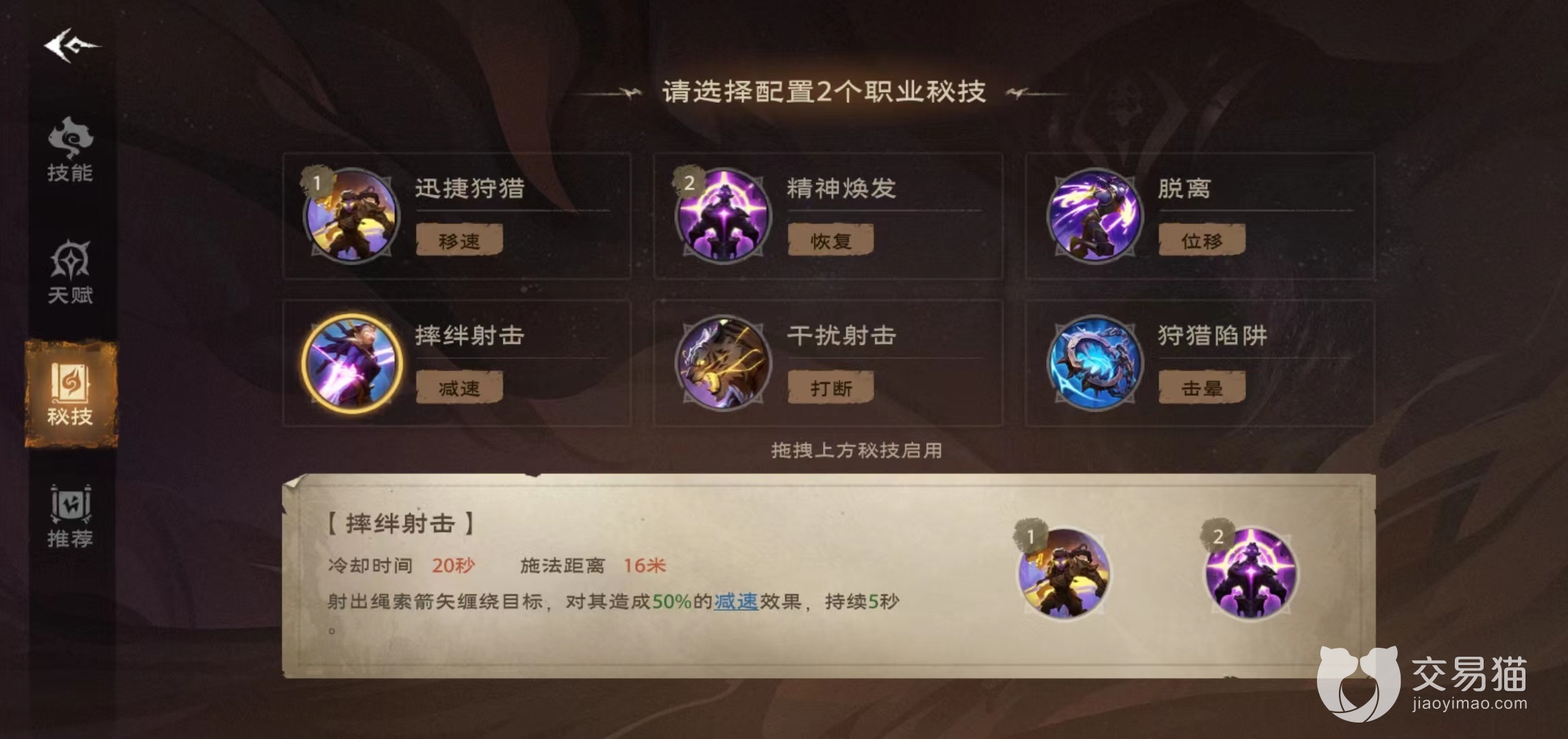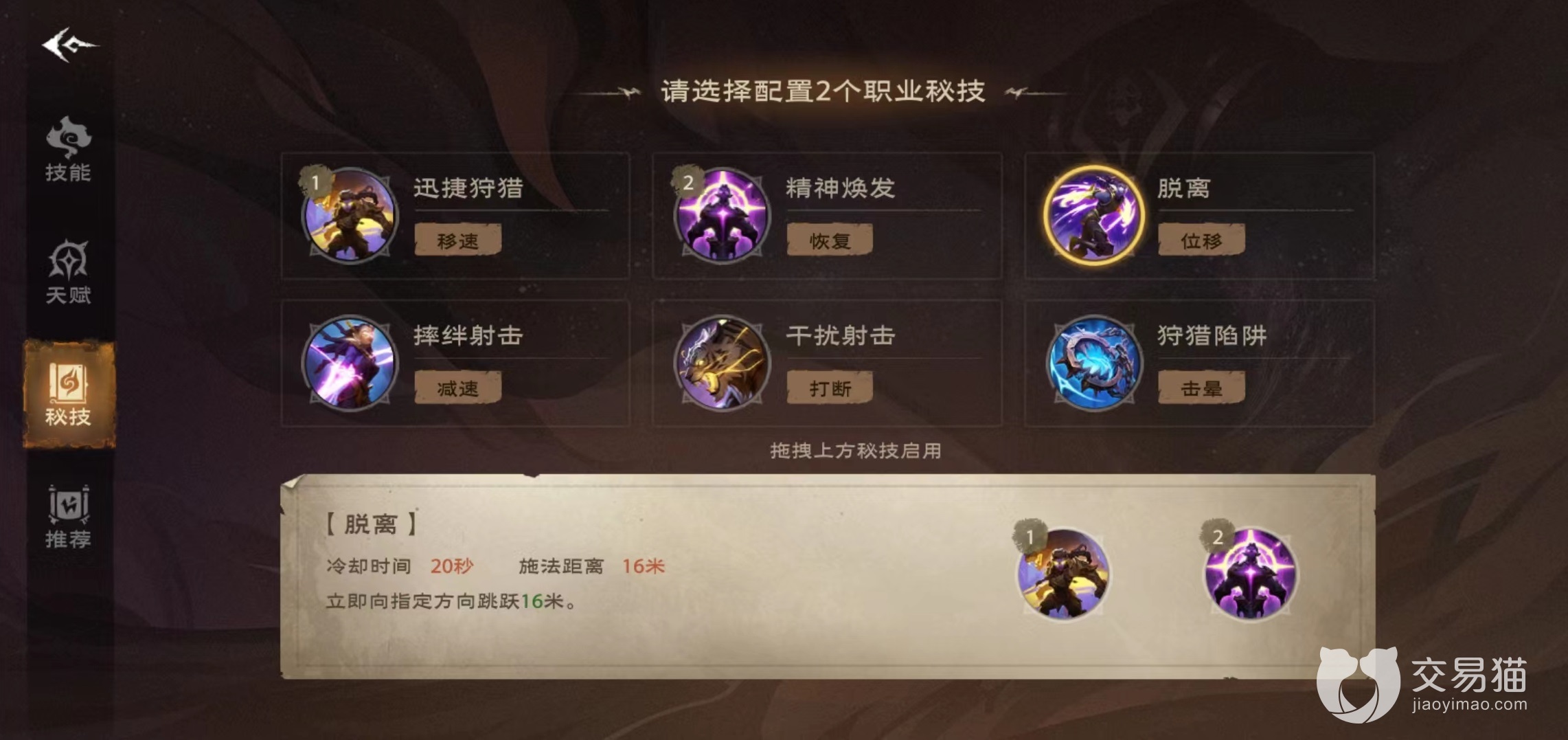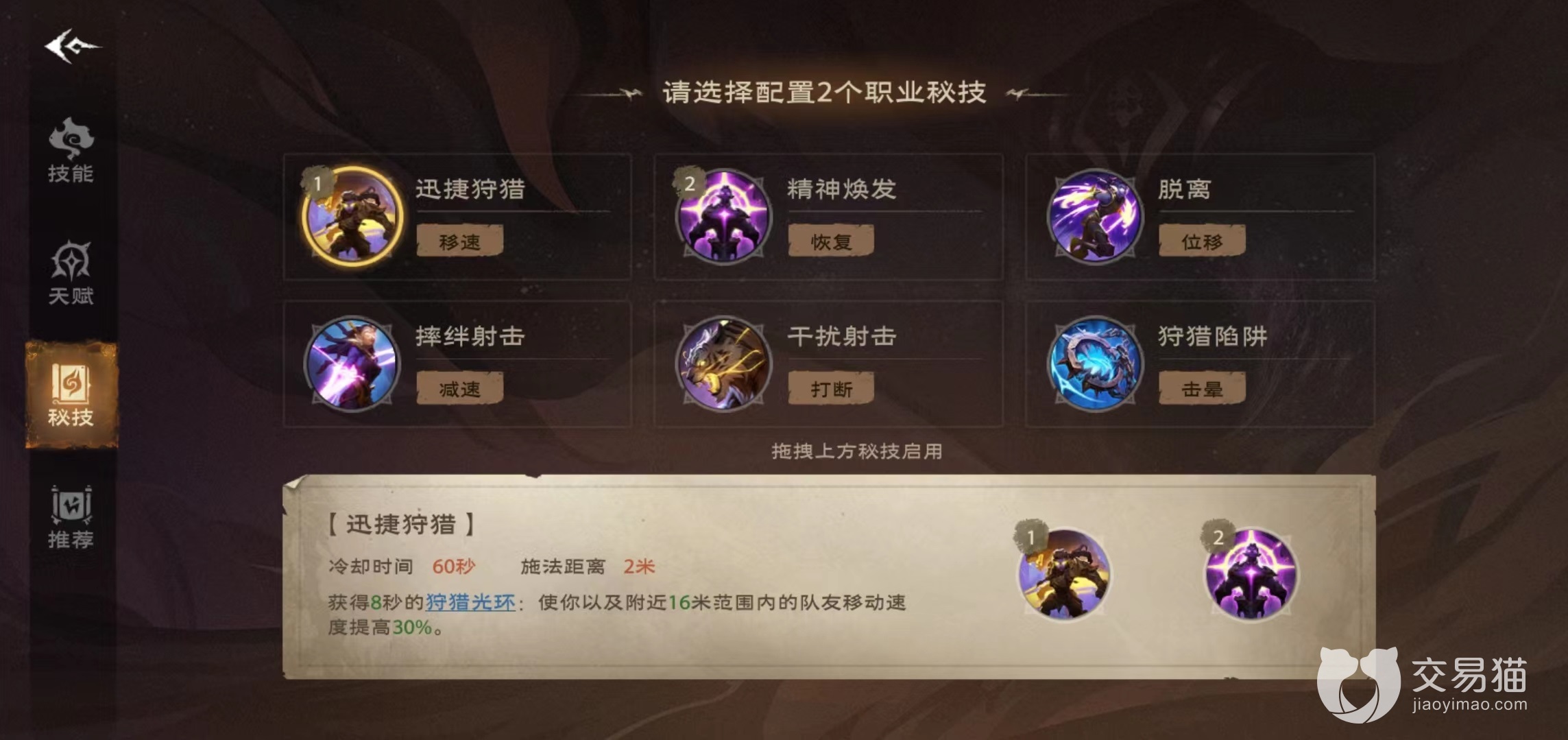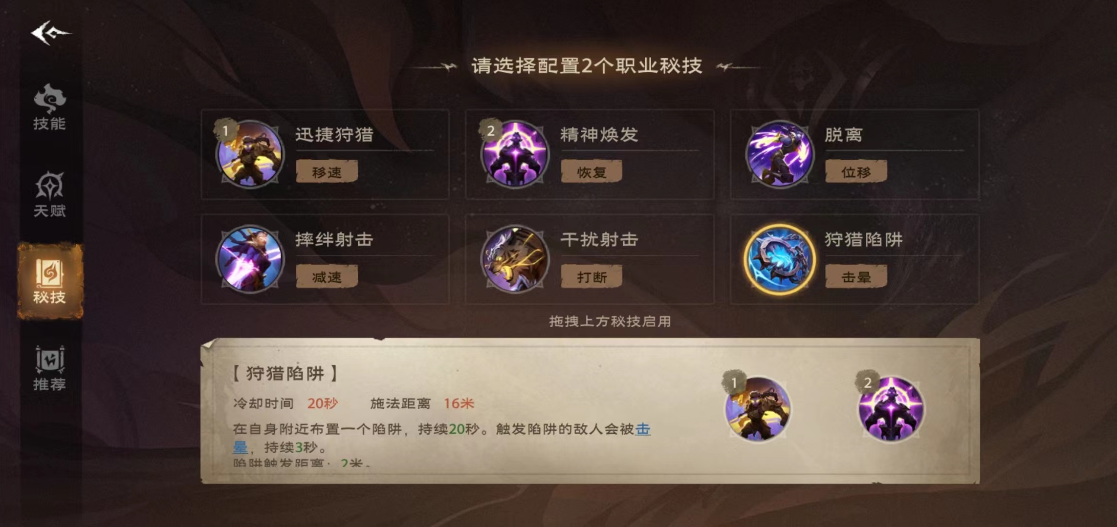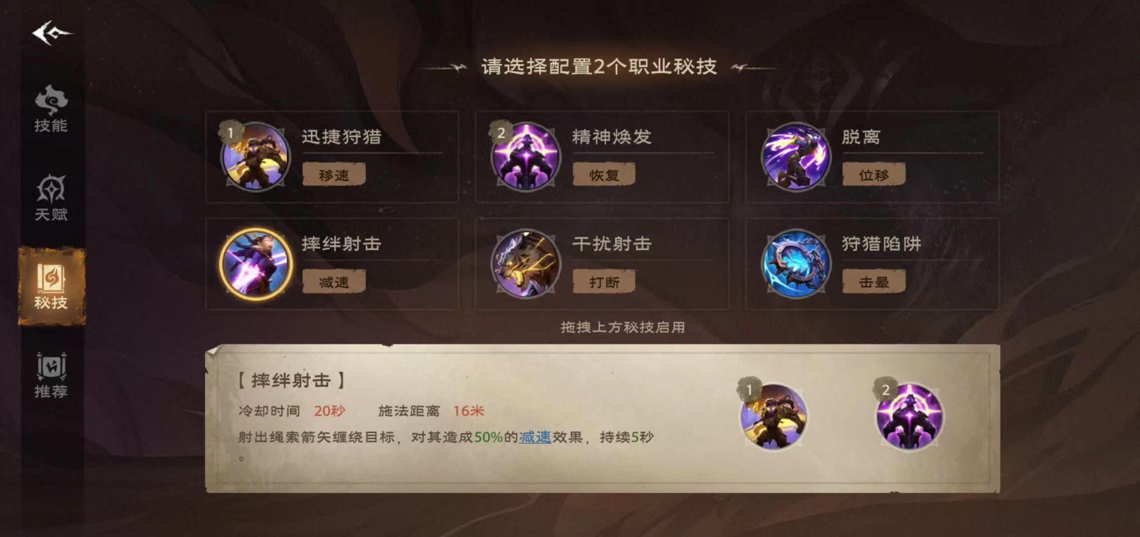 因为目前游戏主要玩法分为副本和PK两大模式,所以在选择秘技时候需要先明确自己想要发展的领域。如果喜欢在副本中打输出,那么小编推荐选择迅捷狩猎和脱离这两个职业秘技。迅捷狩猎作用是使用之后获得狩猎光环,持续8秒钟,这是一个范围增益效果,使自身和周围16米范围内队友移动速度大幅提升,最多能增加到30%。