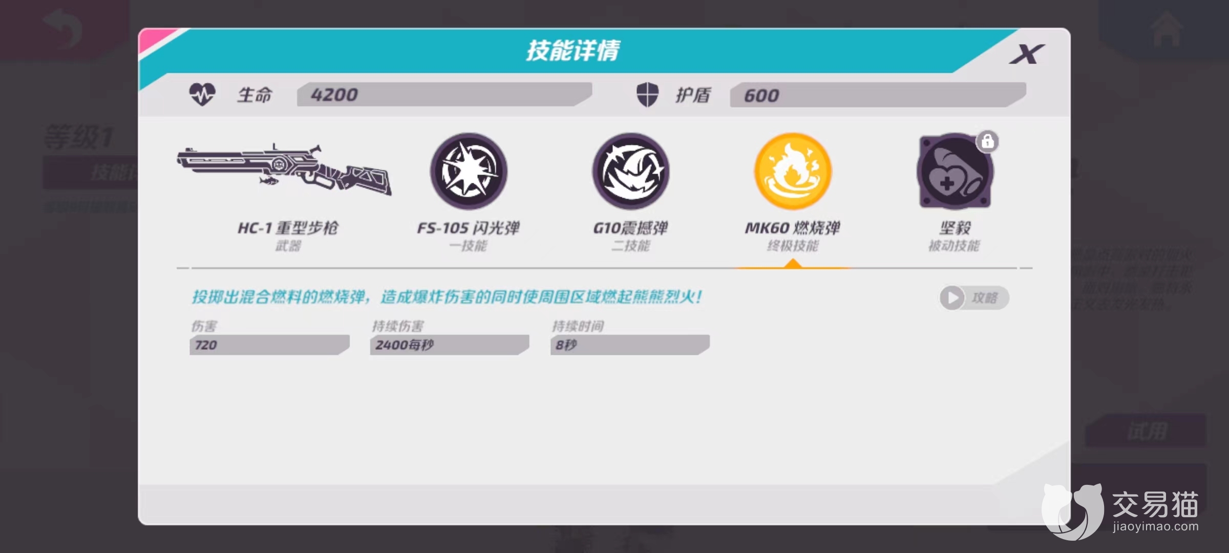 终极技能燃烧弹,投掷出能够燃烧的弹药,在造成爆炸伤害同时会使投掷区域内燃起熊熊烈火,接下来对处于烈火范围中敌人造成持续输出,火焰最多能持续8秒钟。无论是用来打伤害或者是封住对方走位以及限制移动都有着很好作用。被动效果在每次完成子弹装填后,自身获得生命值回复,单次治疗为5%最大血量。