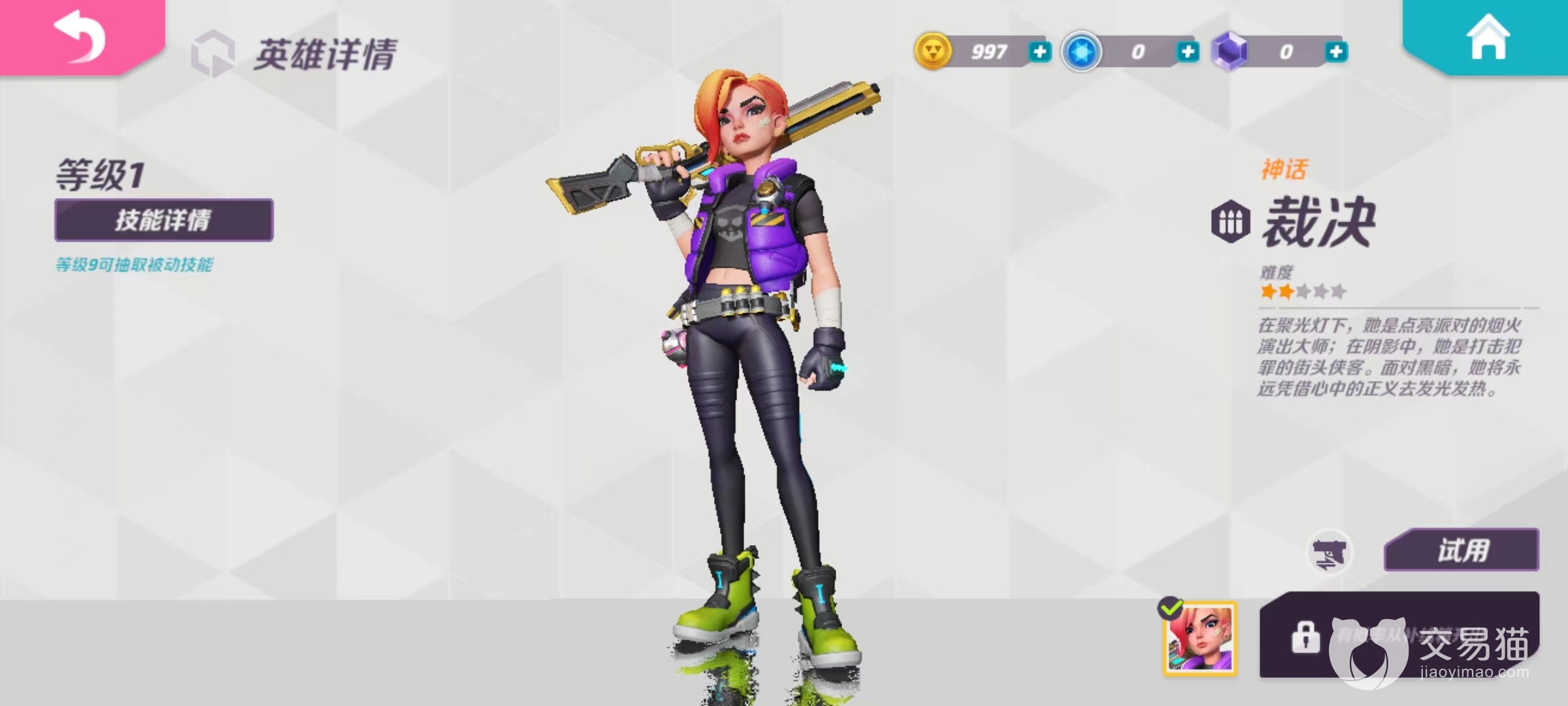作为神话英雄自然不能通过常规手段获取,目前只能在补给箱中开箱子时候有一定几率获得。而补给箱本来就是非常消耗经济的手段,所以对平民玩家来说,想要获得裁决确实有一定难度,如果是土豪玩家强烈建议入手。因为无论是自身使用武器或是各种技能效果,都能够在战斗中发挥出很好作用,而且使用难度非常低,新人也能快速入手。