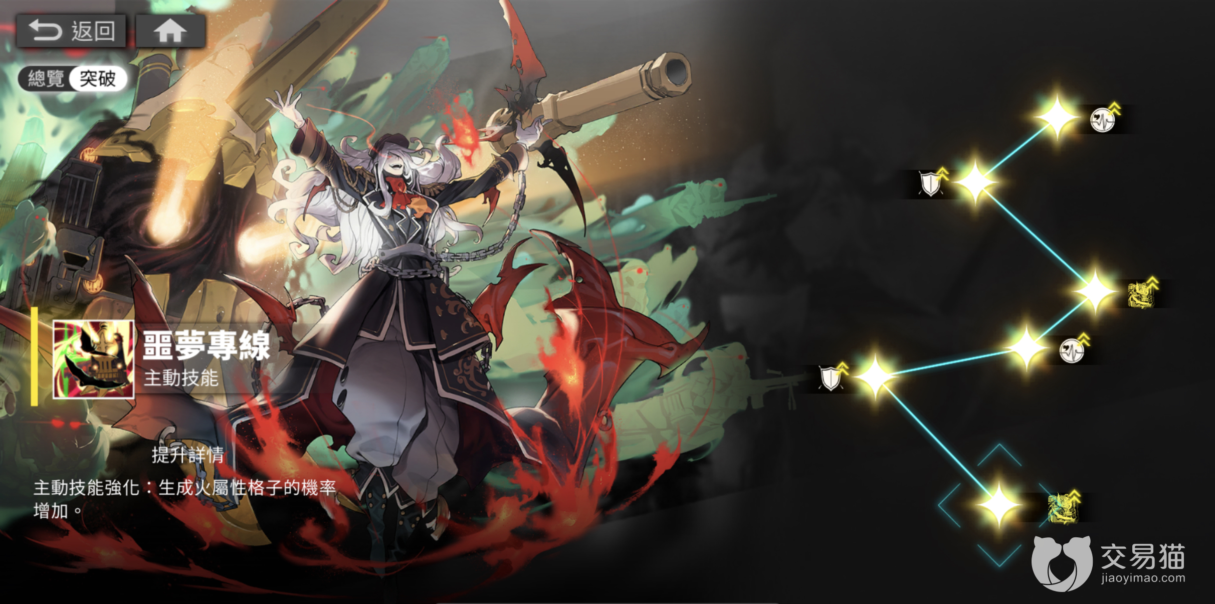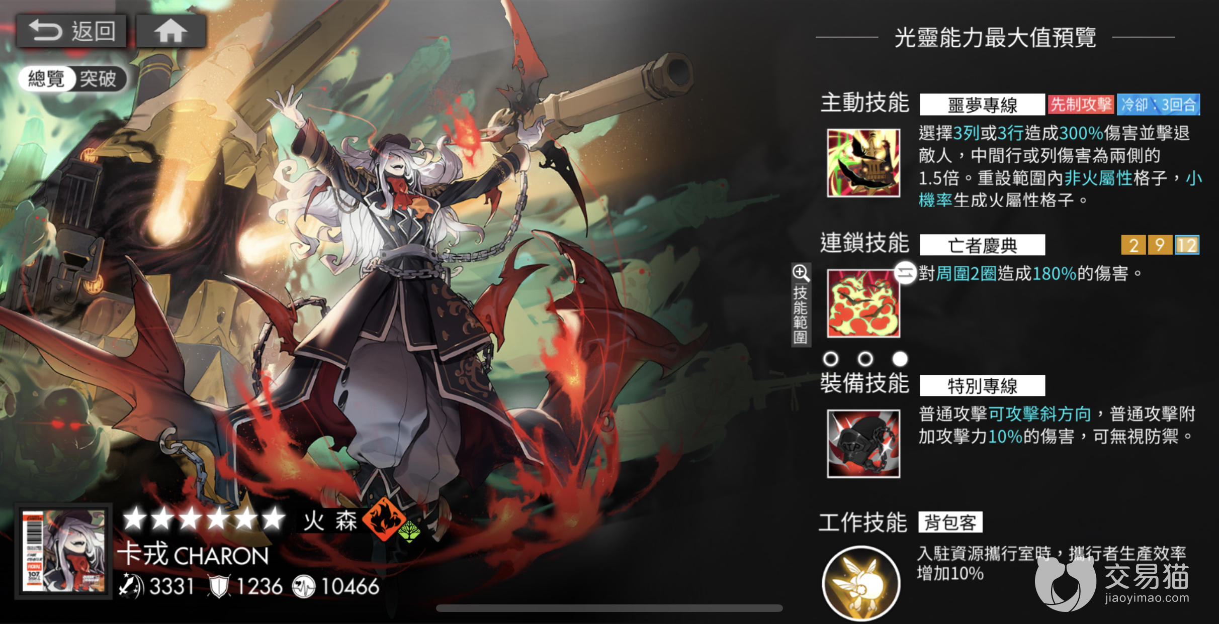卡戎的主动技能【噩梦专线】,作为先制攻击发动,选择三列或三行格子,对其中的敌人造成等同于卡戎自身300%攻击力的伤害并击退敌人,中间的行或列敌人将受到两列的1.5倍伤害。并且主动技能会重置范围内非火属性格子,小概率生成火属性格子。