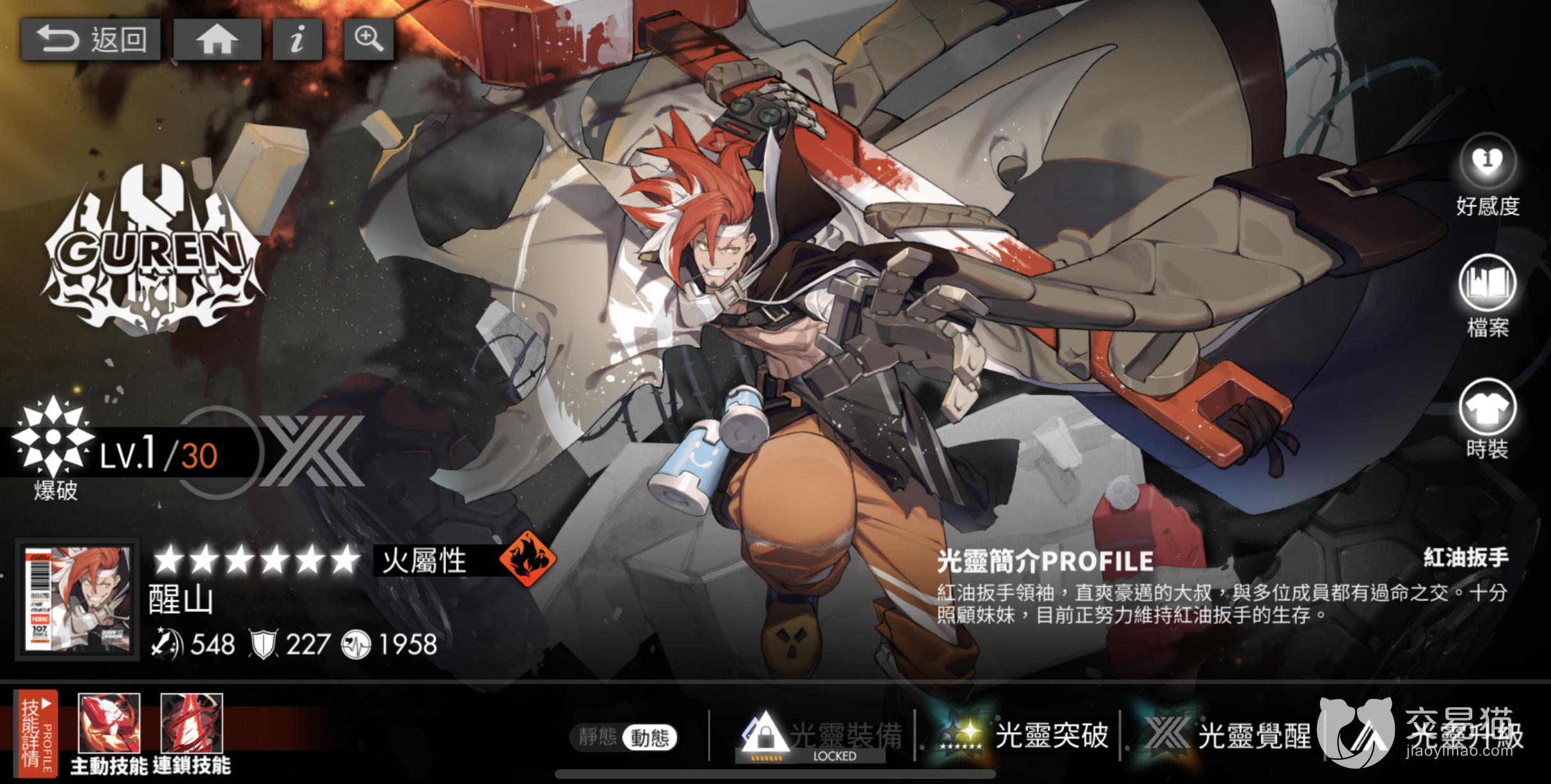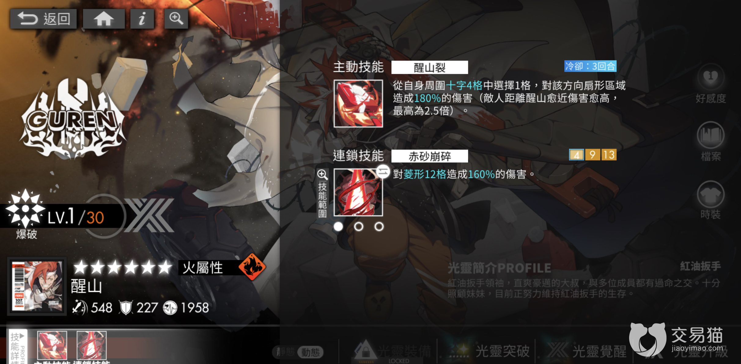 除了卡戎之外,同为火属性六星光灵的醒山在输出方面也与卡戎势均力敌。作为在主线任务第一章节中就登场的光灵,醒山的路人粉丝也非常的多。醒山的定位是爆发,擅长在短时间内对敌方单位造成大量伤害。
