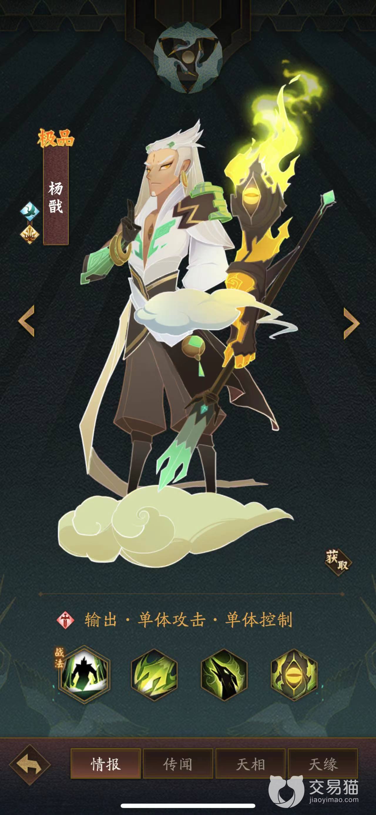 输出角色杨戬是目前仙族战力最高的一位角色,他在战斗中可以进入天神下凡状态,然后召唤哮天犬协助攻击,在这个状态下他的全属性都能提高30%,另外哮天犬还会自动攻击敌方防御最低的敌人,会给防御最低的敌人一个攻击力240%的物伤。杨戬搭配青龙的原因是因为青龙在释放技能后需要休息一个回合,刚好弥补了输出空缺期。