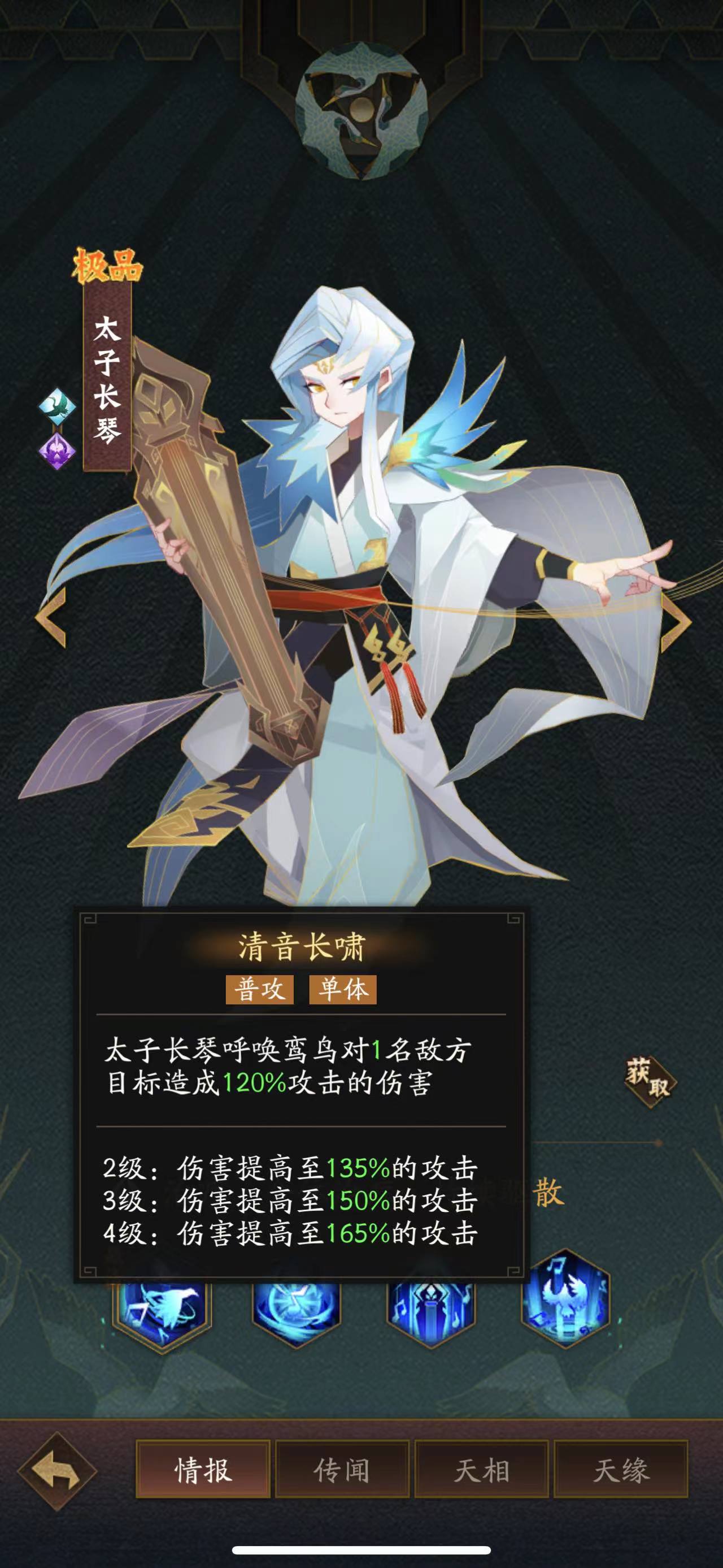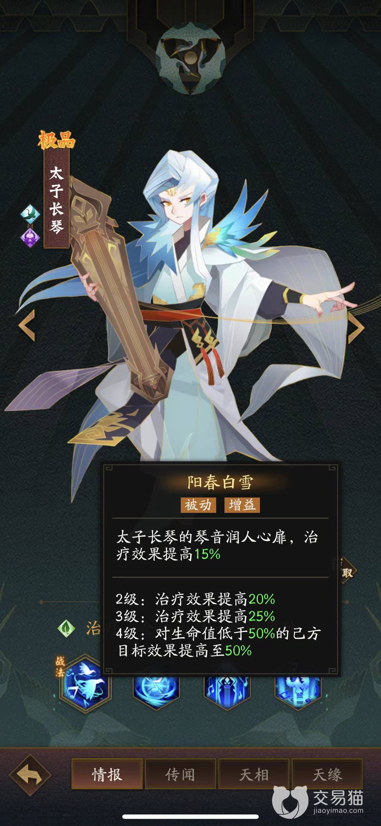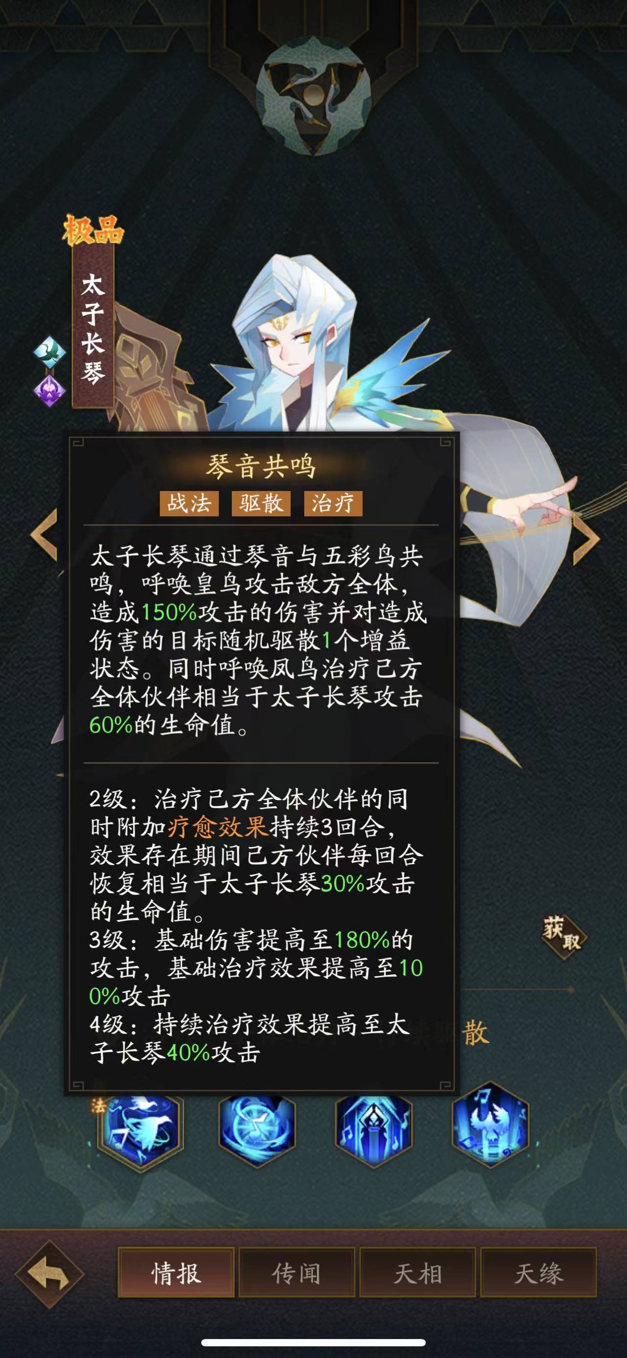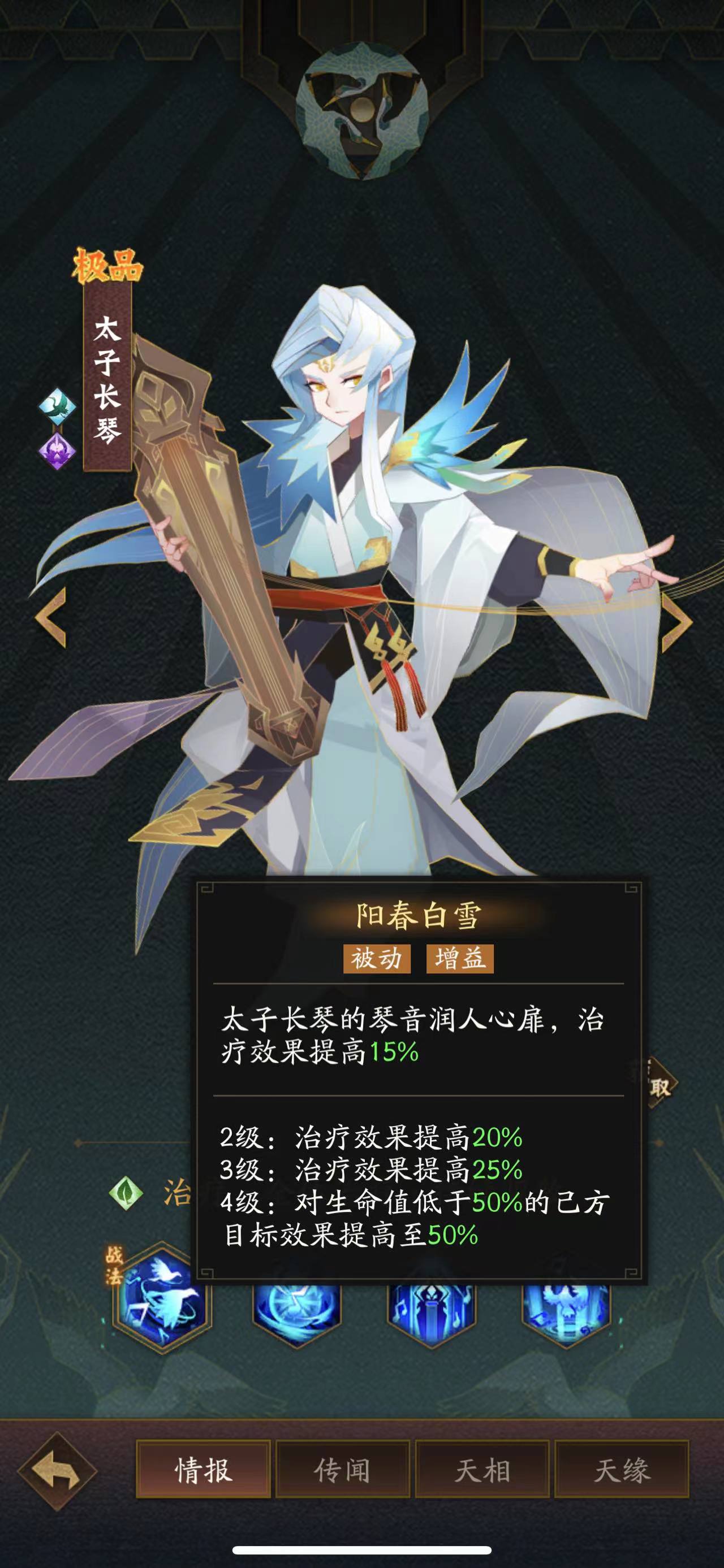 第二个技能叫清音长啸,太子长琴会呼唤鸾鸟对一名敌人造成120%攻击的伤害,这是一个单体伤害,第三个技能叫阳春白雪,这是一个被动增益技能,太子长琴的琴音润人心扉,治疗效果提高15%。