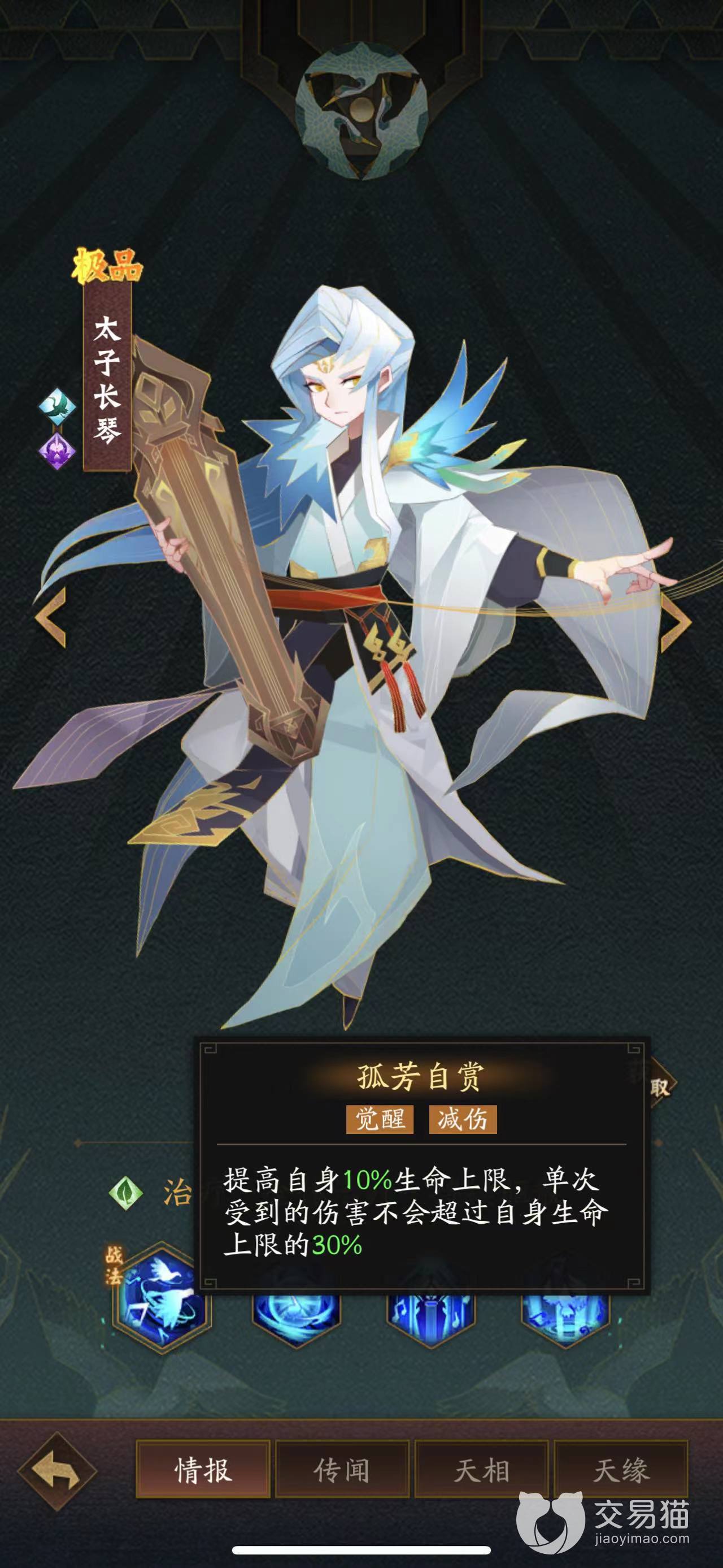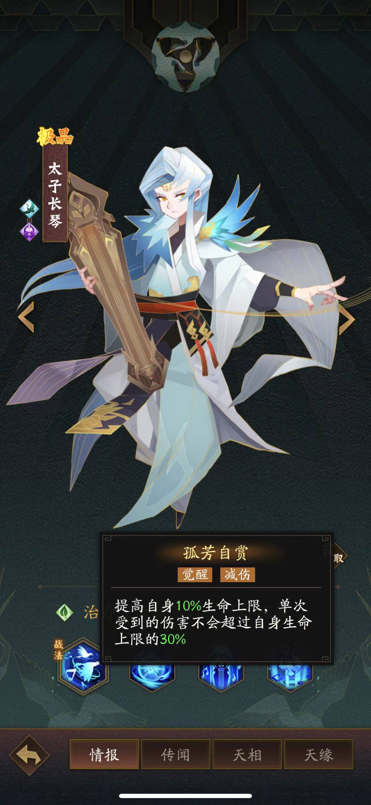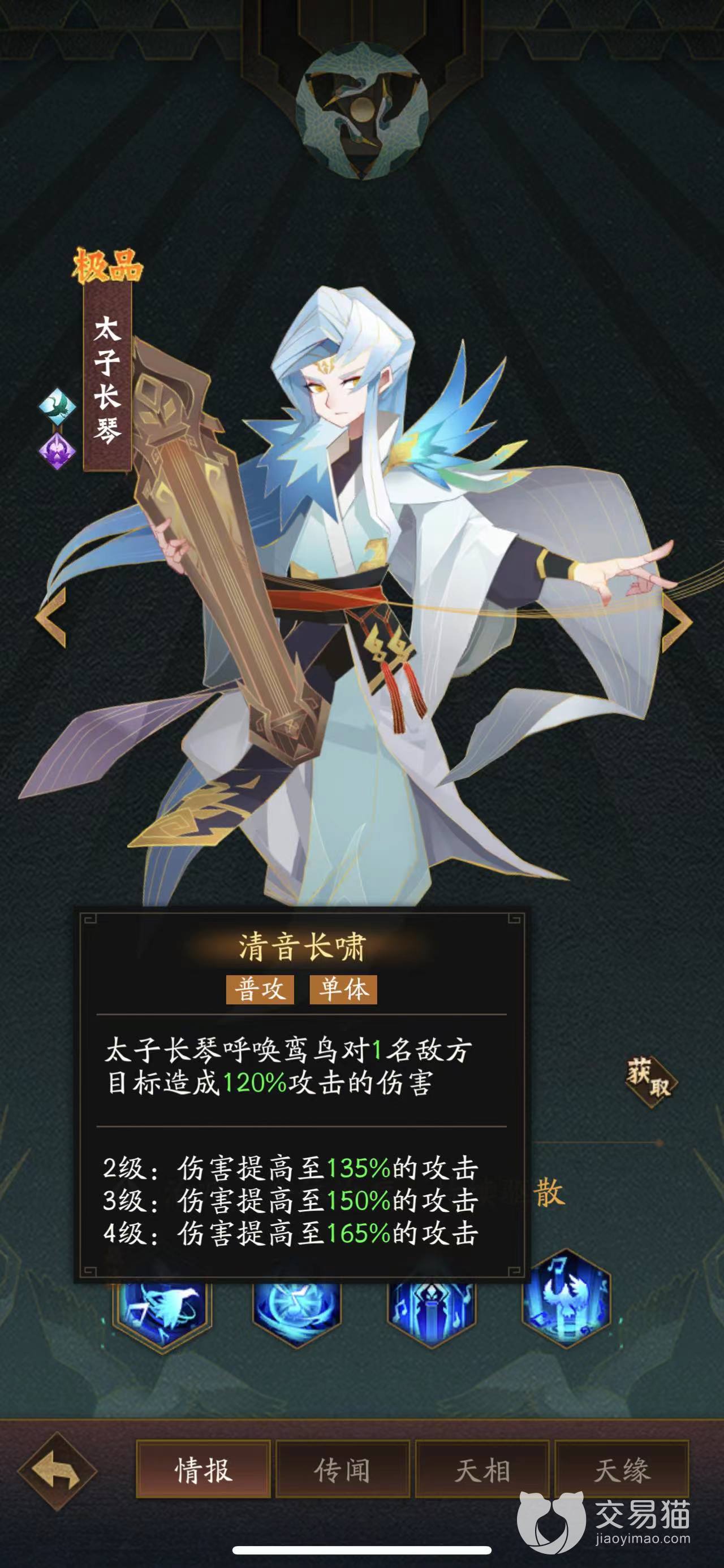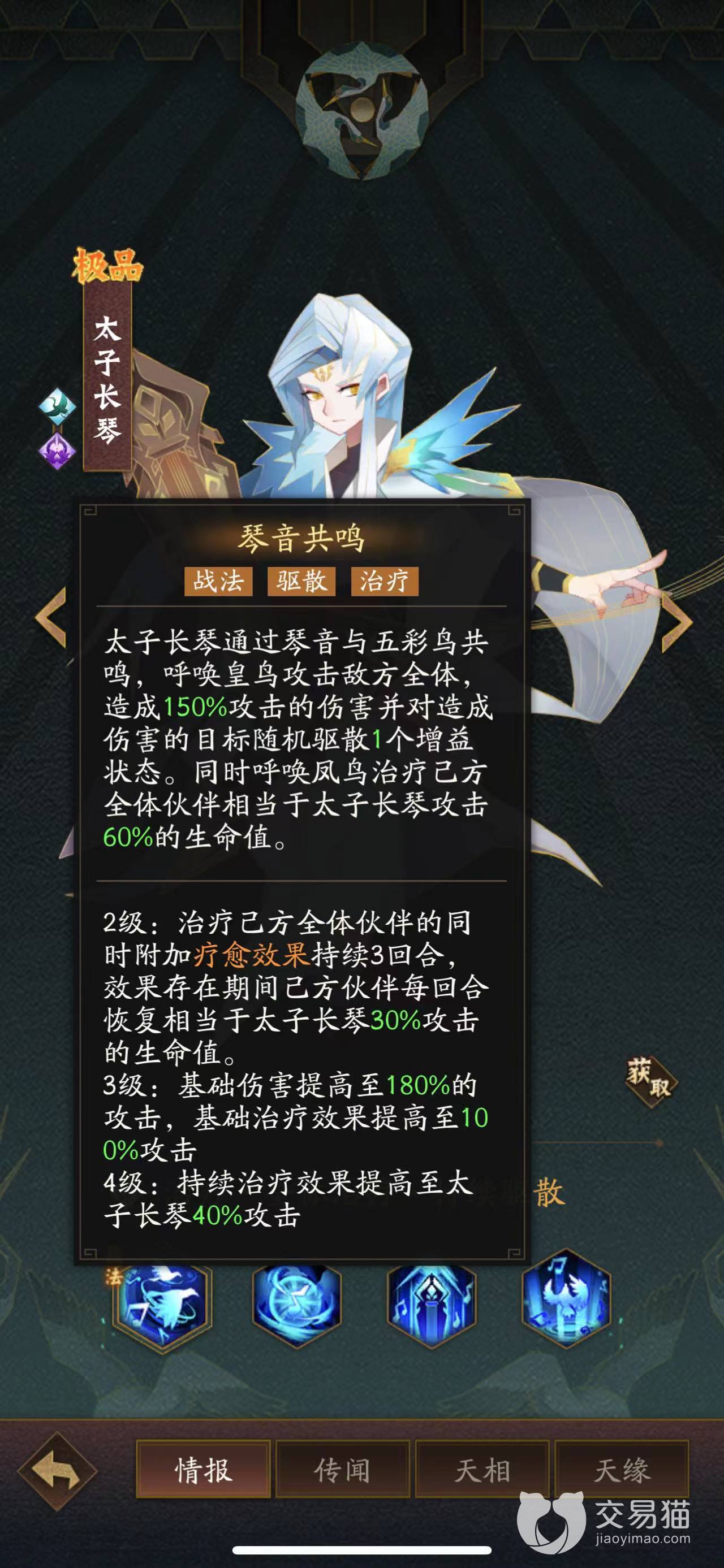 第二个技能叫清音长啸,太子长琴会呼唤鸾鸟对一名敌人造成120%攻击的伤害,这是一个单体伤害,第三个技能叫阳春白雪,这是一个被动增益技能,太子长琴的琴音润人心扉,治疗效果提高15%。