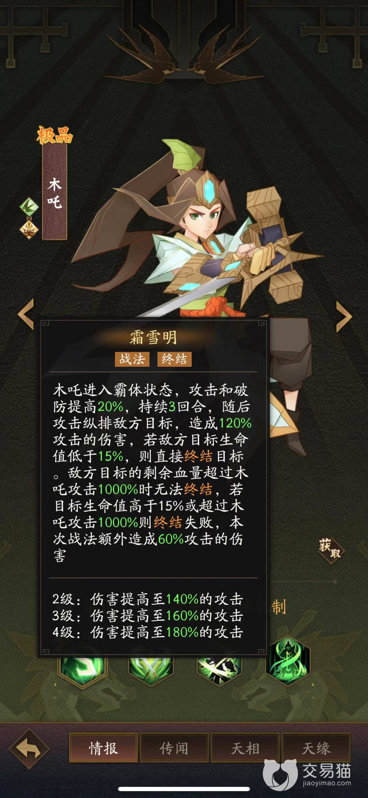 第四个技能叫英姿勃发也属于一个被动技能吧,但是这个技能效果小编个人觉得没有木灵守护强,木吒每命中一个敌人就可以获得一层英姿勃发的被动,每层英姿勃发会使得木吒基础攻击提高1.2%,最高叠加10层。最后一个技能强度还算不错吧。