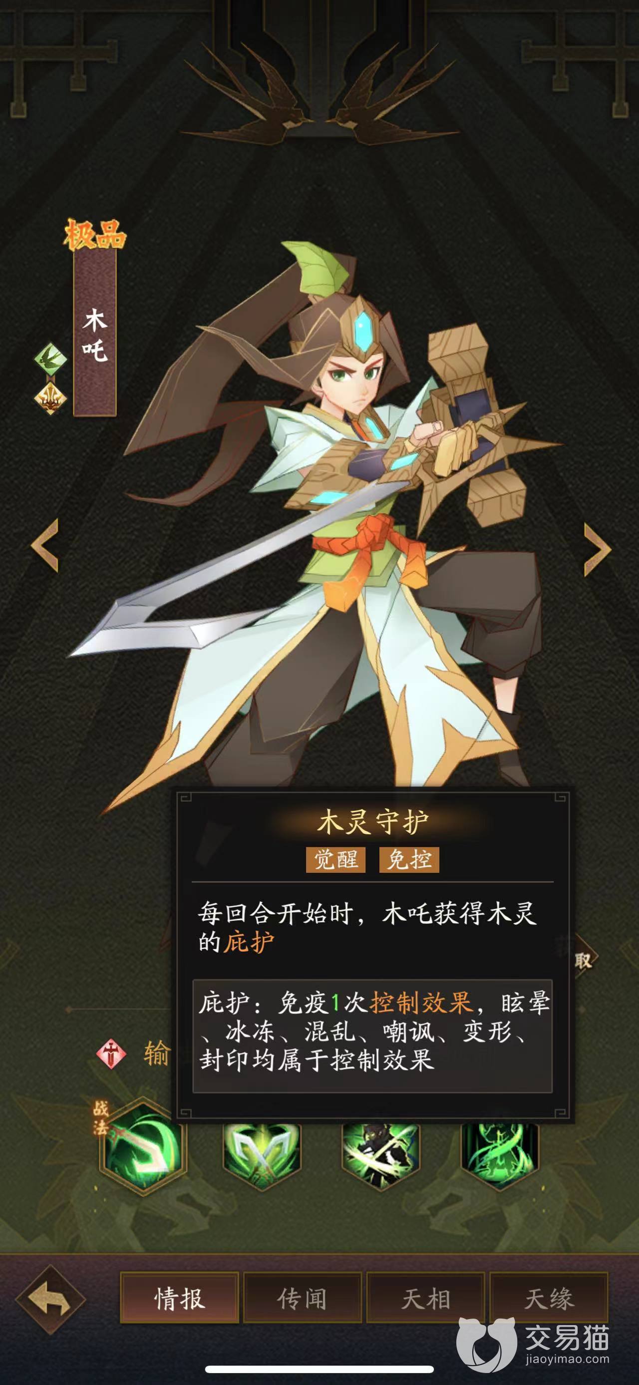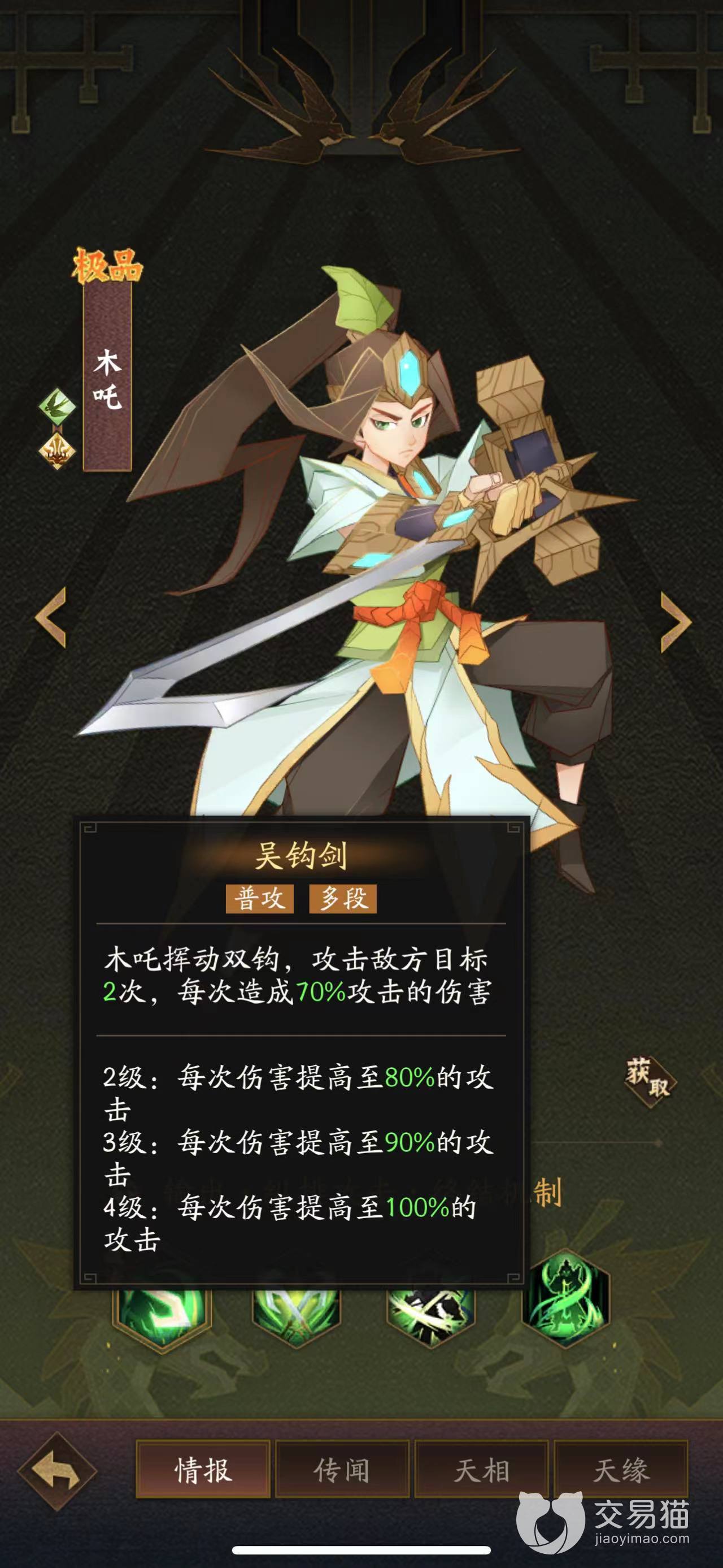 第二个技能叫吴钩剑,是一个多段伤害技能,木吒挥动双钩,攻击敌方目标2次,每次造成70%攻击的伤害,技能可以升级,第三个技能木灵守护是一个被动技能,可以免控,但是这个技能需要木吒觉醒后才可以解锁使用,解锁后木吒获会获得木灵的庇护。在每回合开始的时候。
