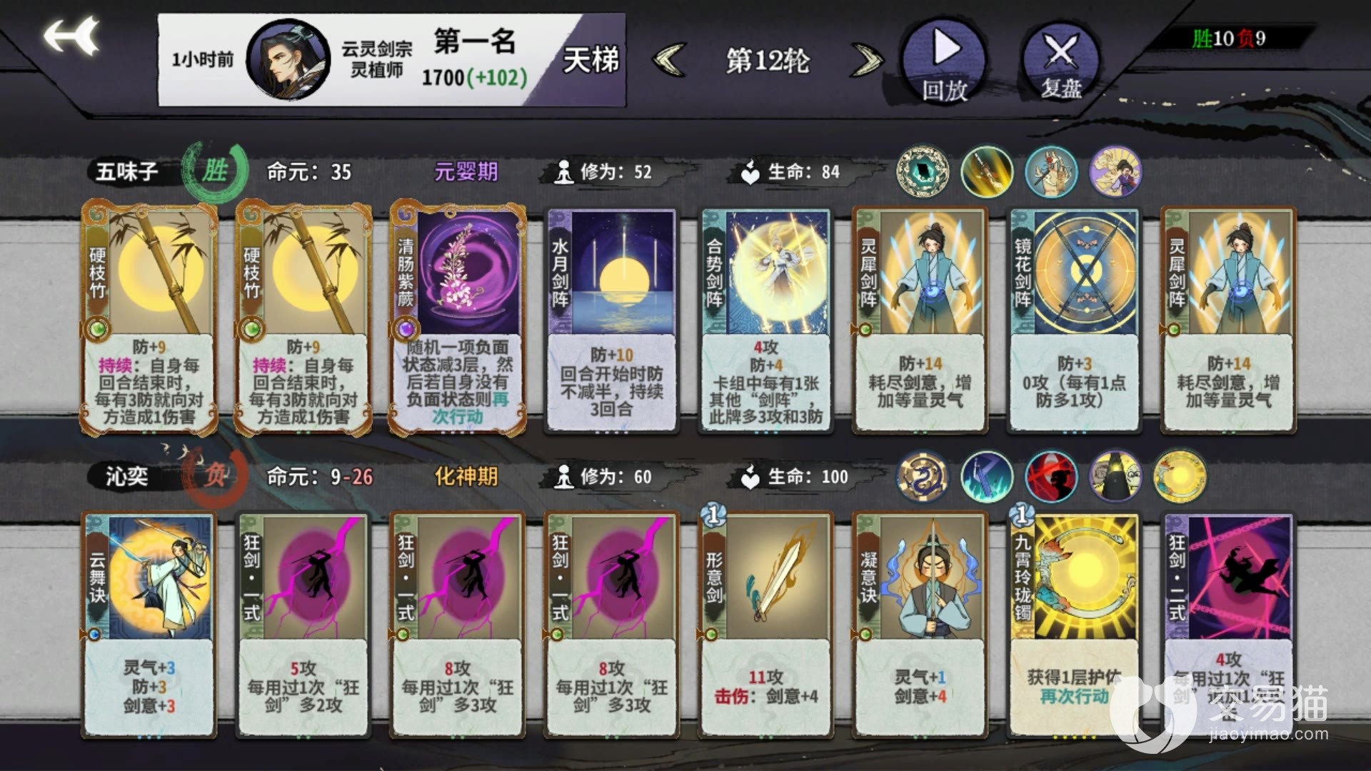 卡组思路就按照上面的配,接下来说说打法思路。开局就用云剑跟对手耗,感觉伤害不够就把慈念曲也给加上。之后就是攒手牌,提升角色等级。如果在这期间,感觉对手伤害高扛不住的话,就用土行曲给自己加防。转弦和调是要一直用的,不断压缩自己卡组的牌。幽绪乱心和天音捆仙看情况放。等剑阵手牌拿了差不多了就能开始反击,最开始就是放水月剑阵,接着就是御空剑阵,然后就是镜花剑阵,最后就是连环收尾。这一套打下来的伤害是非常高的。