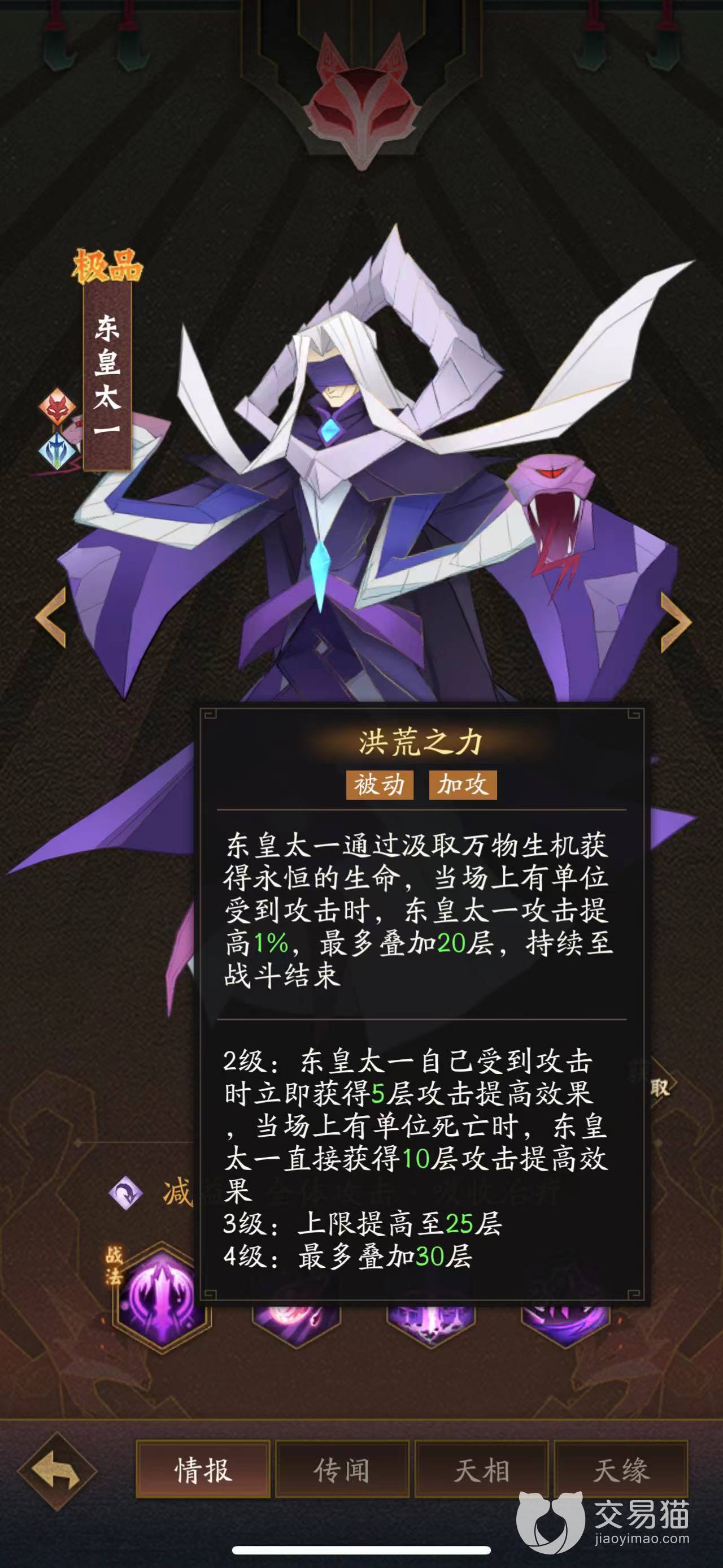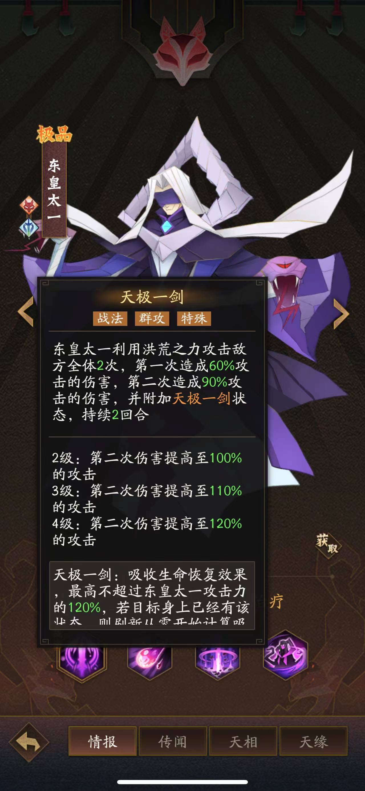 这个角色的主要技能天极一剑,东皇太一会利用洪荒之力对敌方进行2次攻击,第一次造成60%攻击的伤害,第二次造成90%攻击的伤害,并附加天极一剑状态,持续2回合,在配合洪荒之力被动,东皇太一通过汲取万物生机获得永恒的生命,当场上有单位受到攻击时,东皇太一攻击提高1%,最多叠加20层,持续至战斗结束。