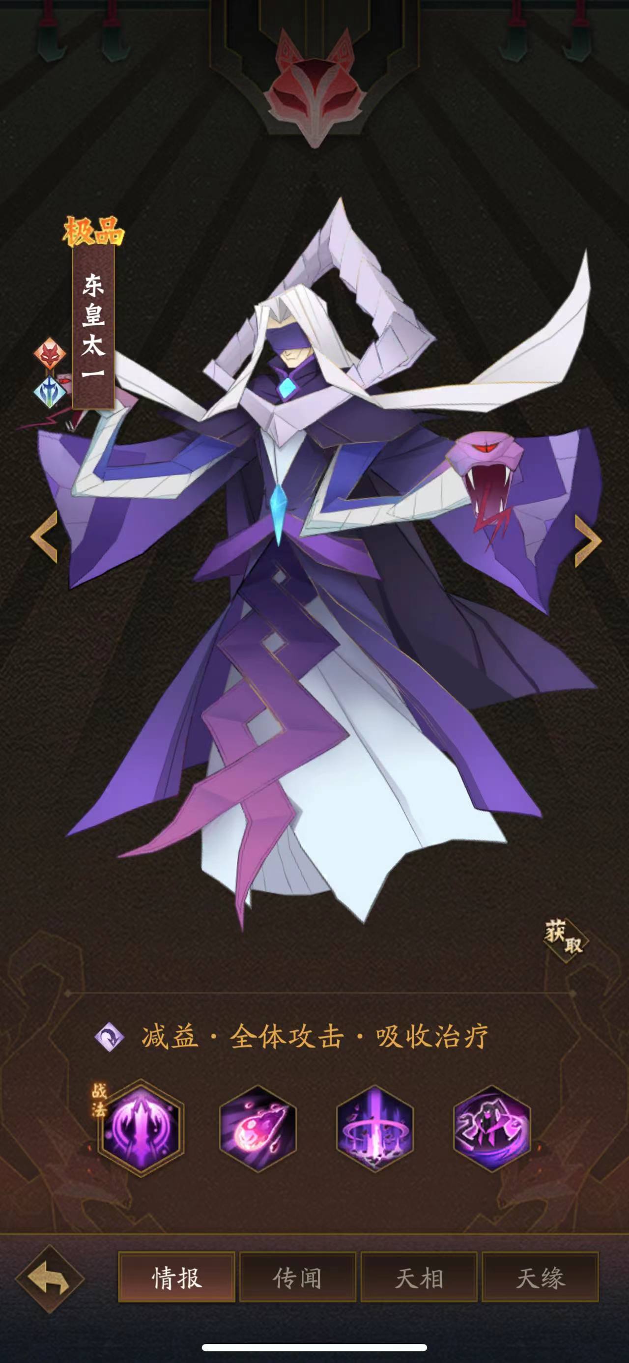 玩家们可以根据自己的喜好选择卡池来抽奖,如果非常喜欢这个角色,小编建议直接选择人族卡池进行抽奖,东皇太一属于上古时期的一个人物了,在技能强度方面也是没话说的,不过这个觉得需要搭配一些辅助卡牌来使用了,收益会比较高,小编会简单的介绍一下东皇太一的技能。