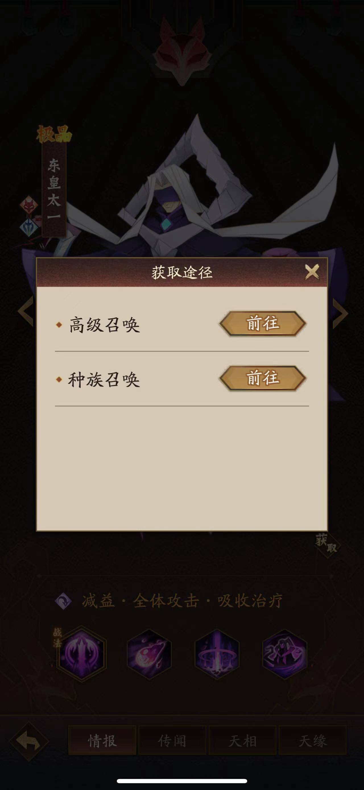 东皇太一属于极品属性橙卡,是一个主打减益效果的角色,获取方式主要是有两种,一种是在种猪召唤卡池中,这个卡池玩家们可以选择自己心仪的属性卡牌,比如神祖,人族,仙族以及鬼族,都是可以自选然后进行抽选的,还有一种获取方式是高级召唤,这个卡池结合了非常多的属性卡,抽取概率也是不太稳定,需要300元宝进行一次抽奖。