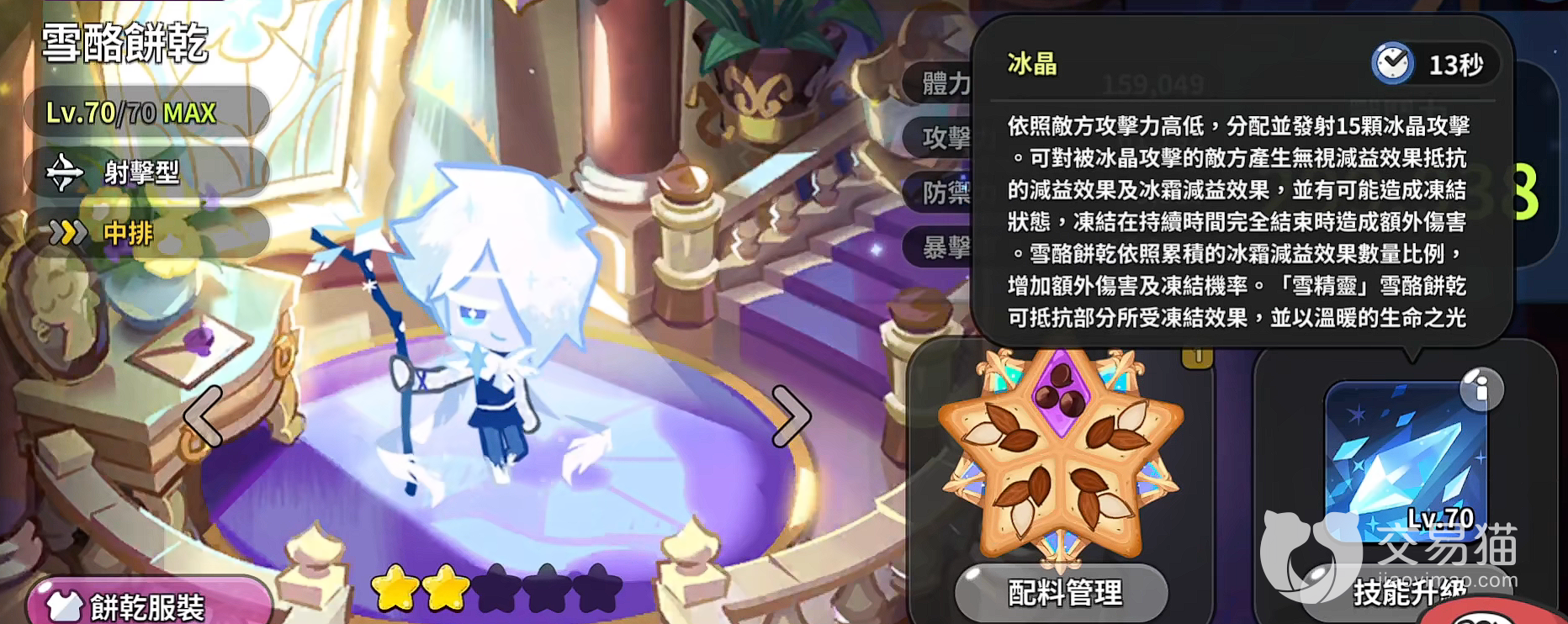 那么,既然冰霜女王饼干都有了,那么白色系的话就不得不提雪酪饼干了。作为同属于冰系队伍的重要组成部分,雪酪饼干在游戏中强度一直处于冰系队伍中的前几水平。本身就有着史诗级别的稀有度,而且还有着强力的输出和控制能力,在一众白色系饼干当中,也是非常建议作为前几进行培养。