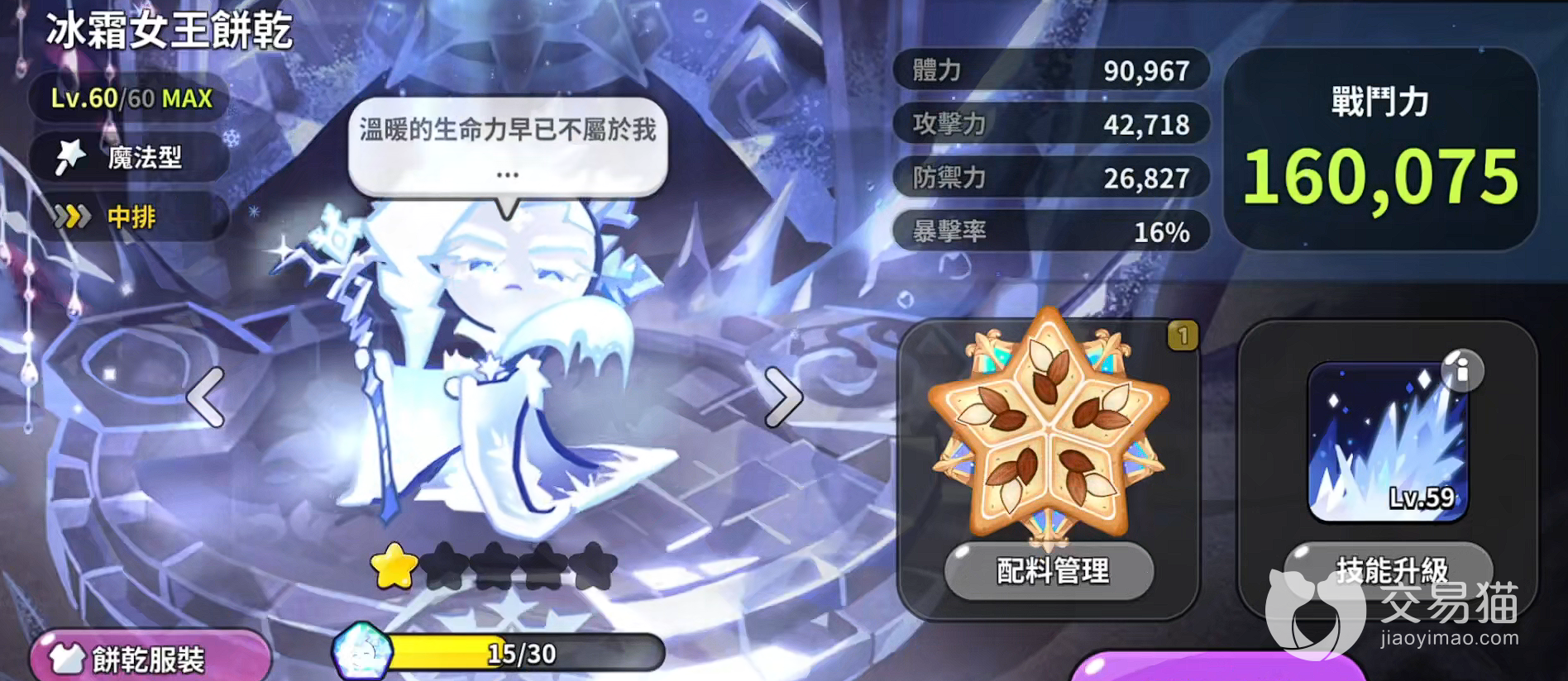 那么如果要说到白色系饼干,那么就不得不提传奇稀有度的冰雪女王饼干。作为冰系队的一员,无论是立绘造型,亦或者是技能特效,绝对属于白色系的领头羊。不仅仅有着不错的控制技能,还有着相当不俗的伤害,是游戏中非常强力的传奇饼干角色。