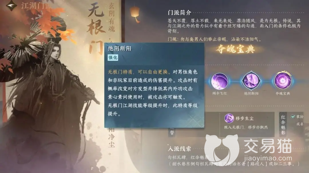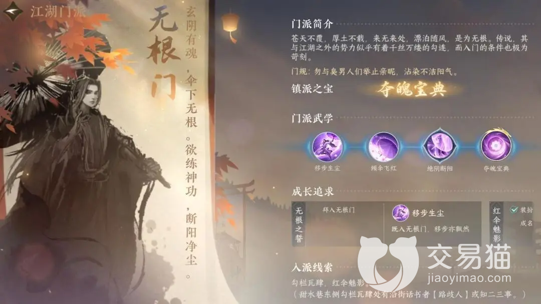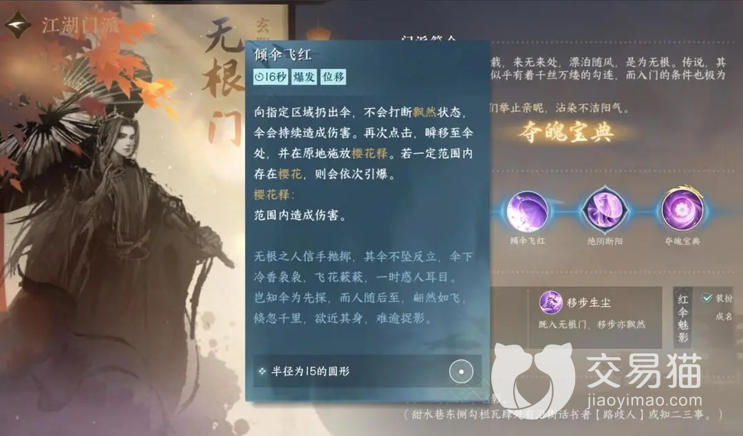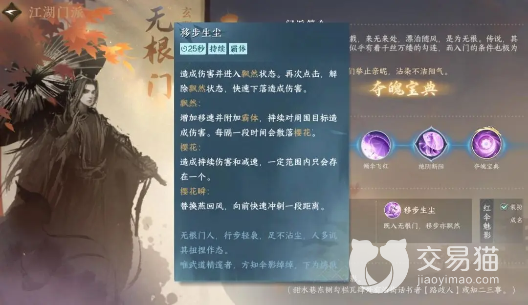 无根门总共有四个专属的技能。移步生尘是无根门的第一个专属技能,这个技能造成的效果是好几段的,同时还能够使得自身进入霸体状态,能够造成持续性的伤害同时对对手造成一个减速的作用。第二个专属技能叫做倾伞飞红,这个门派专属技能造成的伤害是爆发性的,所以伤害的程度比较高,而且在红伞的作用下具备了位移的效果,比较适合移步生尘连招使用,非常顺滑。