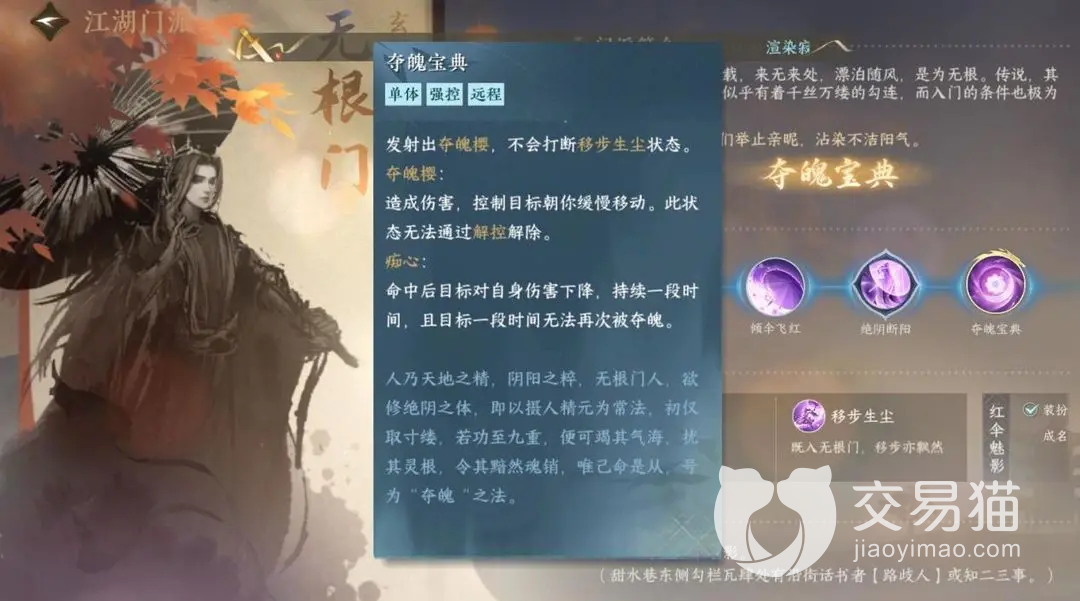夺魄宝典是无根门的第四个专属技能,这个技能是一个远程控制类型的技能,在距离对手较远的地方能够对对手进行控制,而且这个技能没办法被对手解除类型的技能所解除控制。