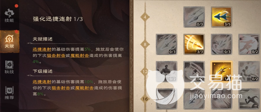 迅捷连射:这个技能会在吟唱3秒内对敌方相继射出4支箭,这个技能不能触发连击。但是当稳定值达到一定数值的时候,就会额外射出1/2/3/4支箭。是一个单体伤害技能,推荐天赋:1、爆炸箭:普攻伤害和迅捷连射与扩散射击命中敌人时有几率使下次狙击射击或魔能射击附带一支爆炸箭,对目标和周围敌人造成伤害。