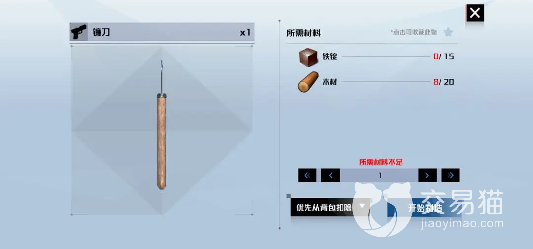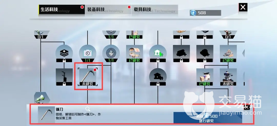 镰刀属于“生活科技”中的一种物品,因此想获得它的话首先得前往这一板块将它的图纸进行解锁,它的图纸价格并不算高,五百个能量点就可以兑换,换到手之后,你就可以从图纸上看到具体的合成途径了。