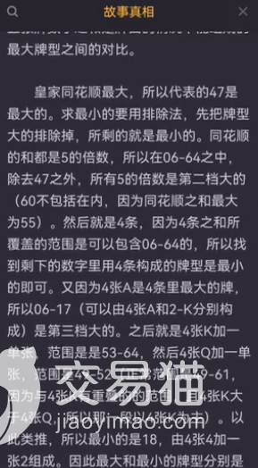 最终的投票:谜题与扑克的牌型有关系,同花顺是里面最大的,这就代表47这个数字是最大的,首先要将大牌消除,这样剩下的都是小牌,同花顺的和是5的倍数。因为4张A是三档内最大的,所以最大与最小的牌分别是47与18,密码就是4718。