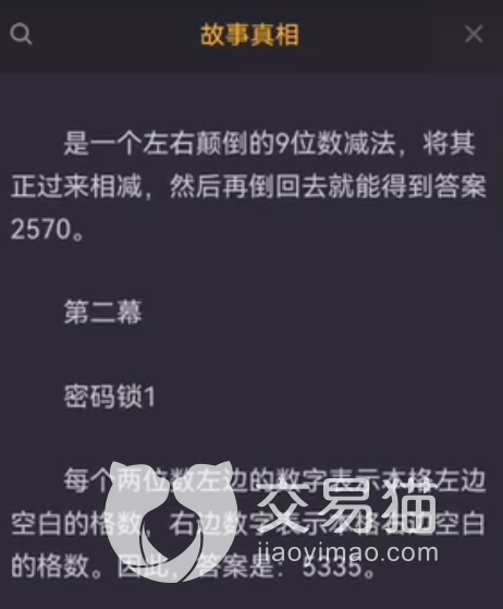 第一幕的密码是指房门上的密码锁,这是一个颠倒的九位减法,玩家可以先从正面减去它,通过反转才可以获得答案,最终解出来的答案是2570。玩家输入正确密码之后,便可以将房门打开。