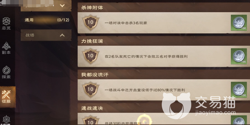 如果是征服成就的话,也比较难获取,当然达成的条件比较难,但是机制是非常简单的,比如力往狂澜成就,在挑战的时候队伍里面有两名队友死亡的情况,这个时候玩家击败对面三名敌人,并且在挑战最后获胜即可获取成就,还有速战速决,只要大家在挑战开始到结束,在30秒之内,并且这一场战斗获得胜利的话,就可以获得速战速决成就,相比副本成就,征服成就更好理解。