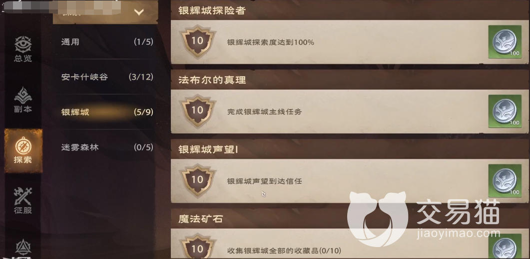 其实最好获取的是探索类的成就,探索类成就只要大家按时按点的跟主线任务一直走就可以完成,比如说上面的银辉城保卫者,这个成就大家只要跟随主线走完银辉城,然后上面的主线任务全部都完成没有跳过,就可以获得这个成就,又例如百发百中,在出现任务里面会有一次射击训练,大家在射击训练的时候会触发一个事件,只要完成这个射击训练触发的事件,大家就可以获取百发百中的成就,过目不忘这个成就也是关于探索玩法的,在上面大家领取一次记忆训练事件完成的奖励,就可以获取过目不忘的成就,所以相比其他的成就而言,大家要是想获取更多成就奖励的话,探索部分是大家的第一选择。