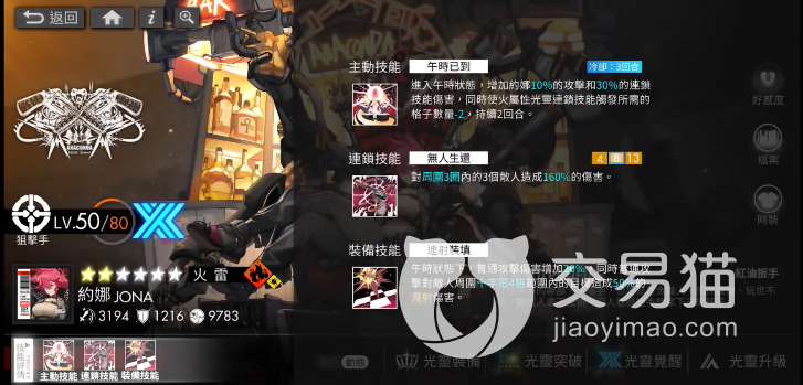 游戏中每一个角色都有三个技能一个是主动技能和连锁技能,还有装备技能,而且角色是可以进行觉醒突破的,这个角色的初始主动技能叫“午时已到”这个技能的冷却时间大概是15秒左右,使用这个技能的时候,会增加约拿10%的攻击和30%的连锁技能伤害,持续时间是2回合,约拿觉醒到最高等级的时候,在进入午时状态时,会增加约拿10%的攻击和30%的连锁技能伤害。