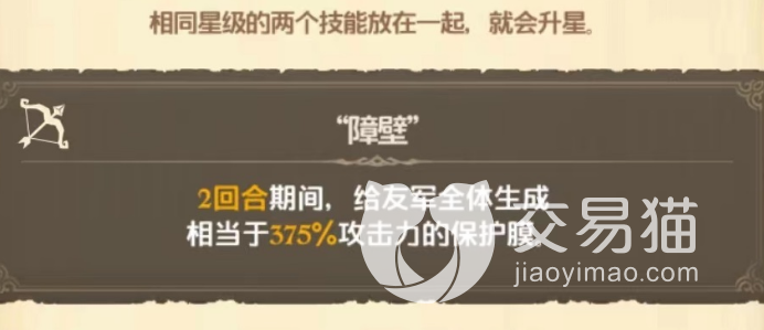 二技能是一个防御技能,使用这个障壁技能的时候是可以给己方全体的成员带来护盾,这个护盾在这里叫做保护膜,保护膜是可以带来375%的防御数值,这个数值在肉盾角色中不算少了,而且这个护盾的持续时间还是两个回合,所以大家要是遇到的强力敌人,可以在关键时刻用这个技能。