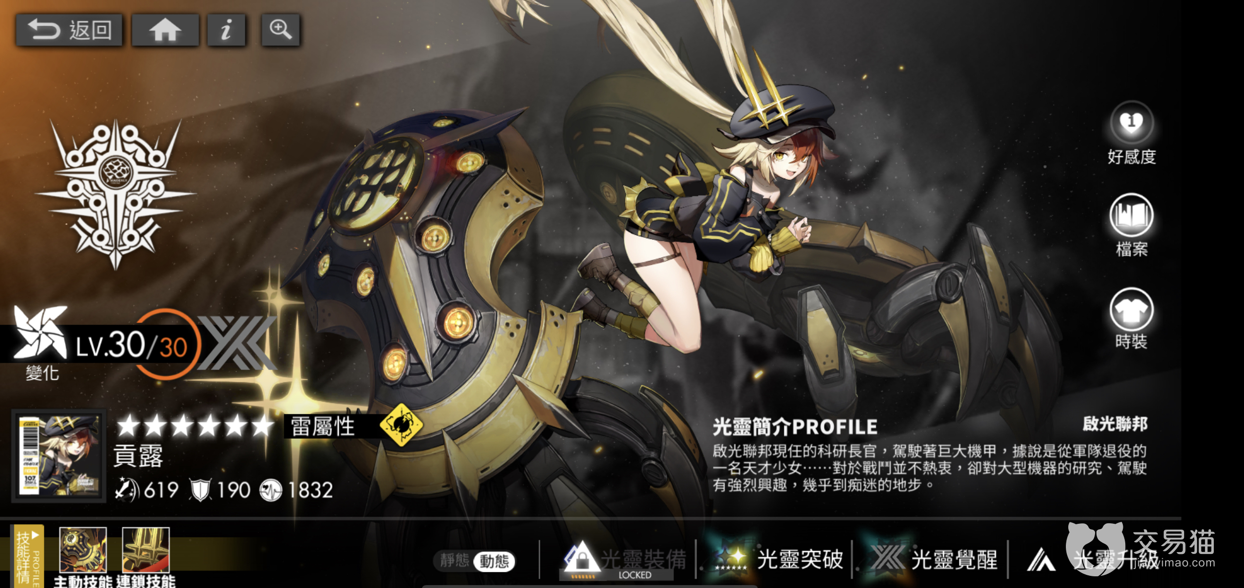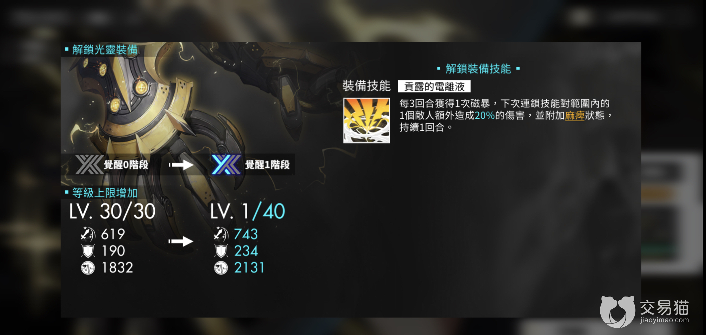 贡露在升级至觉醒一后将解锁装备技能【贡露的电离液】,战斗开始后每三回合获得一次磁暴,下一次连锁技能队范围内的一名敌方单位额为造成20%的伤害,并对其附加麻痹效果,持续一回合。