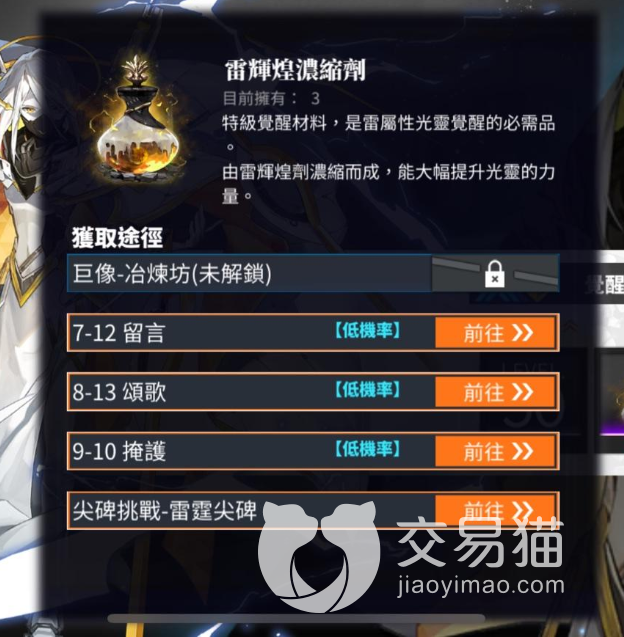 其中的雷耀斑尘砂可以从2-4、2-15、2-10等关卡挑战获得。推荐玩家们选择2-15,只有这一关卡是固定掉落雷耀斑尘砂。雷辉煌素的固定掉落则是关卡2-2,尖碑挑战-雷霆尖碑中也能够掉落。