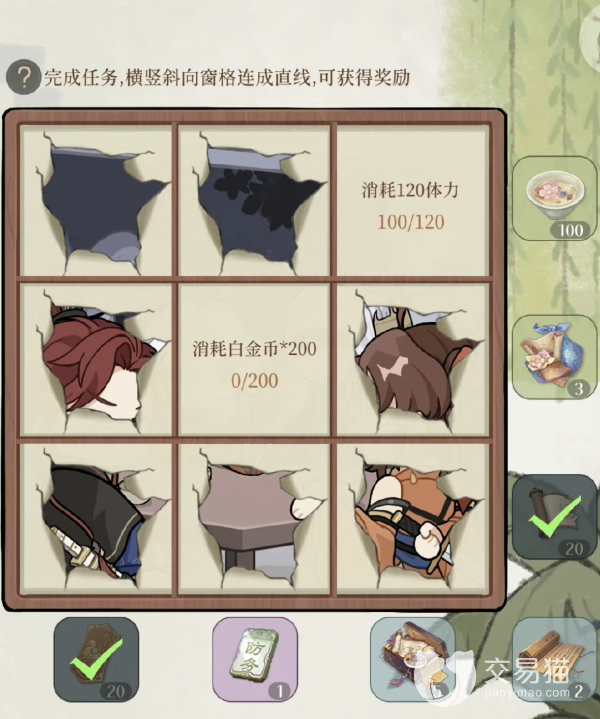 其次是楼主查岗活动。这一活动是通过解锁九宫格中的任务,将已完成任务链接成横、纵、斜三类曲线后就能获得体力、行囊、经验书、改命盘道具、阴兵令、密探好感礼包以及玩家们最关注的【防务情报】了。而这一活动的难度非常低,几乎是玩家们随意点点就能完成的,也不需要花费太多的时间,可以快速完成获得奖励。