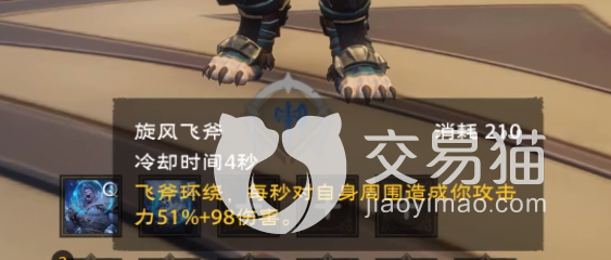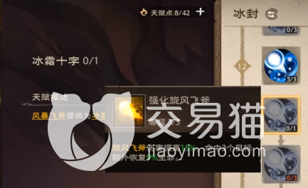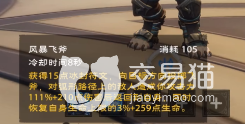 第5个技能、风暴飞斧:会对路径上敌人造成110%的伤害,回复自身生命值。这个技能属于直线伤害技能,如果后期咋学习指定天赋后会代替风暴飞斧的技能位置。推荐天赋:风暴加护:风暴飞斧在释放之后偏斜的几率会增加。2、强化风暴飞斧:风暴飞斧伤害提高,生命回复量提高。(可升3级)第6个技能、冰霜十字:对目标造成伤害,使自己受到伤害降低,可充能两次。推荐天赋选择:寒风凛冽:普攻有几率使风暴飞斧和冰霜十字冷却减少。2、强化冰霜十字:冰霜十字伤害提高,获取冰霜符文提高。