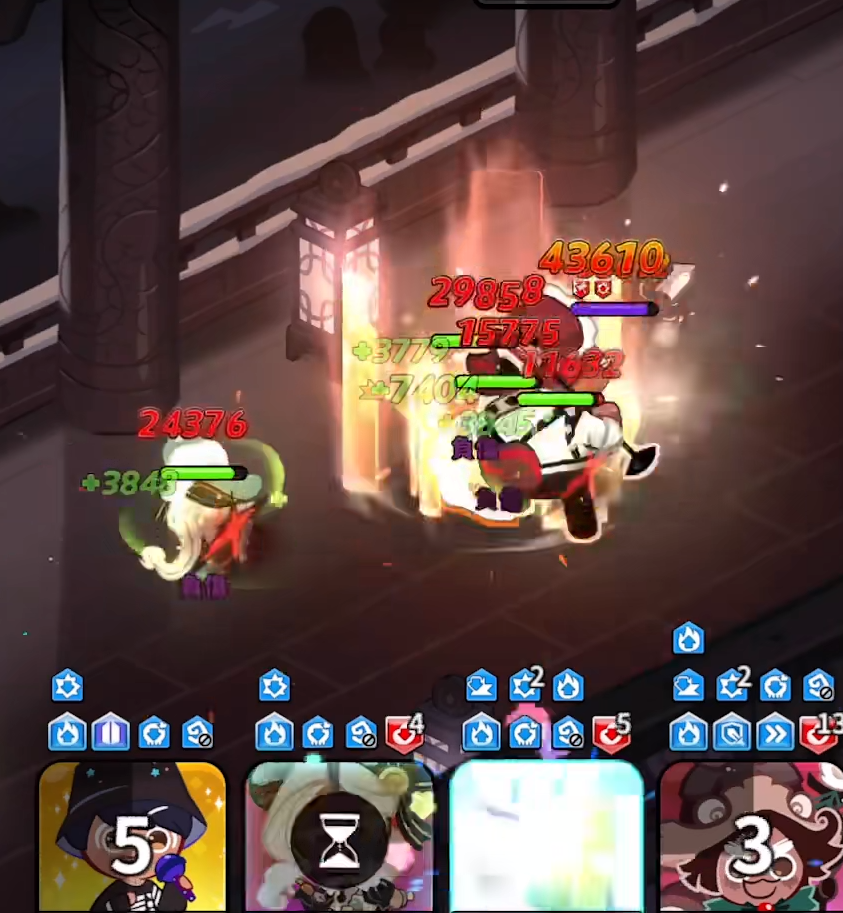 松果饼干如果是推图的话,只需要搭配斗篷就足以应对绝大部分的关卡,队伍的搭配选择雪酪和查尔斯即可。这两位都可以帮助松果饼干触发连锁眩晕。即使对方有着免疫,也是可以造成额外伤害的。