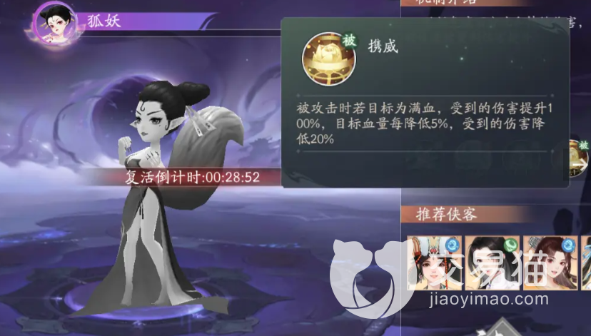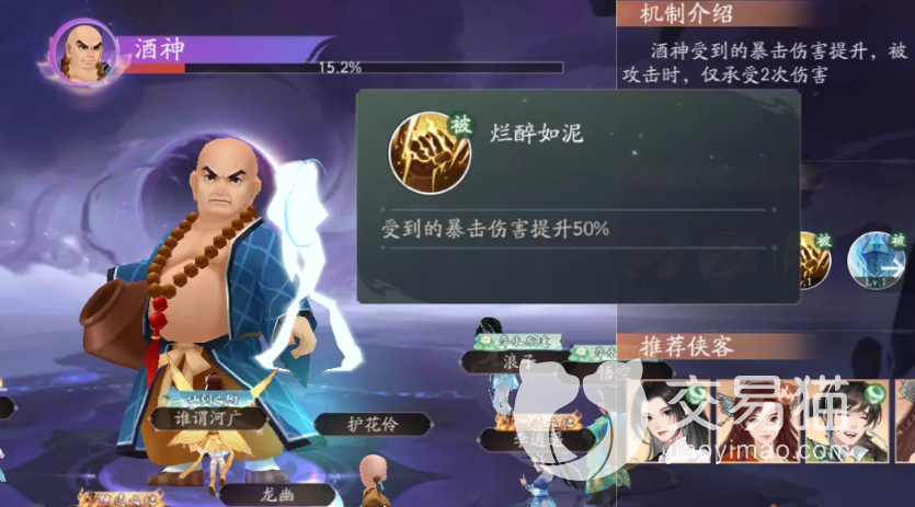 受到伤害的时候根据侠客的血量来提供增伤或者减伤,注定是个持久战,所以要打狐狸最好得有奶。普通阵容水属性雪见加上风属性的沈欺霜,外加1个李大娘。如果是氪金大佬的阵容则可以直接套用上面打酒神的那一套暴击套,风属性的林月如是必带的,然后搭配一些有着很高爆发的输出角色,像是雷属的花、火属的南宫,阴阳的重楼。