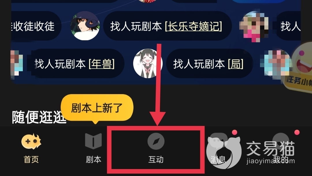 首先打开我们的百变大侦探软件,来到主页如上图所示。可以看到屏幕的最下面有五个选项,分别是:首页、剧本、互动、消息和我的。我们点击【互动】选项。