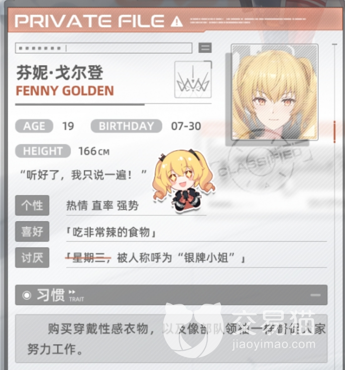 整体评价:芬妮戈尔登善于使用霰弹枪,具有高效突击能力的霰弹角色能够迅速接近敌人,特别擅长对抗身形厚重的敌人,因此被赞誉为奥林匹斯的黄金狮子的金发少女,在近战中展现出了强大的战斗能力。喜欢近战的玩家,可以尝试这个角色,其战斗表现十分亮眼。