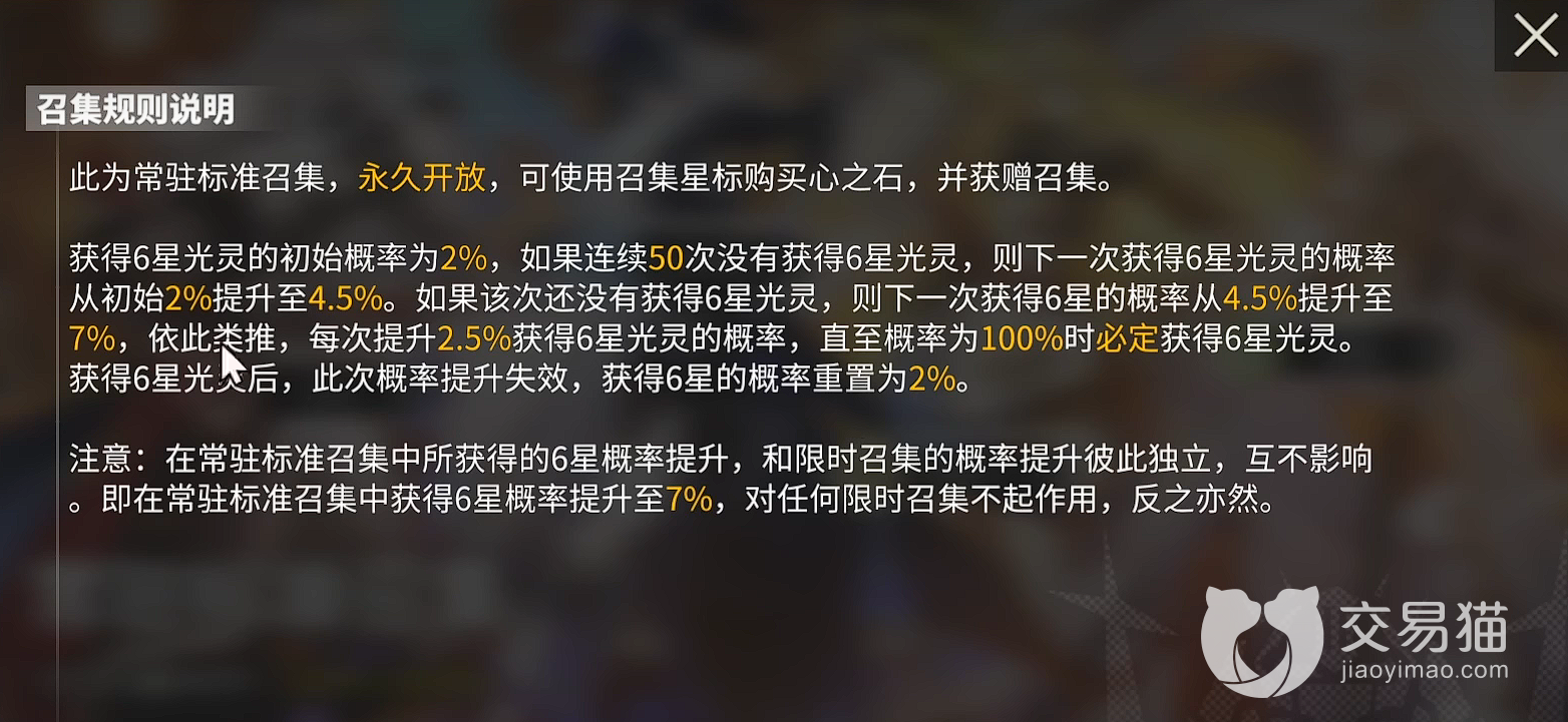 常驻卡池六星初始概率为2%,如果连续50次没有抽到六星角色的话,那么下一次六星角色的概率会从2%提升到4.5%,增加2.5%。后每抽一次,如果没有抽到,都可以增加2.5%,直到概率100%时,必定抽到六星。直到抽到六星角色后即可失效,回归概率2%。