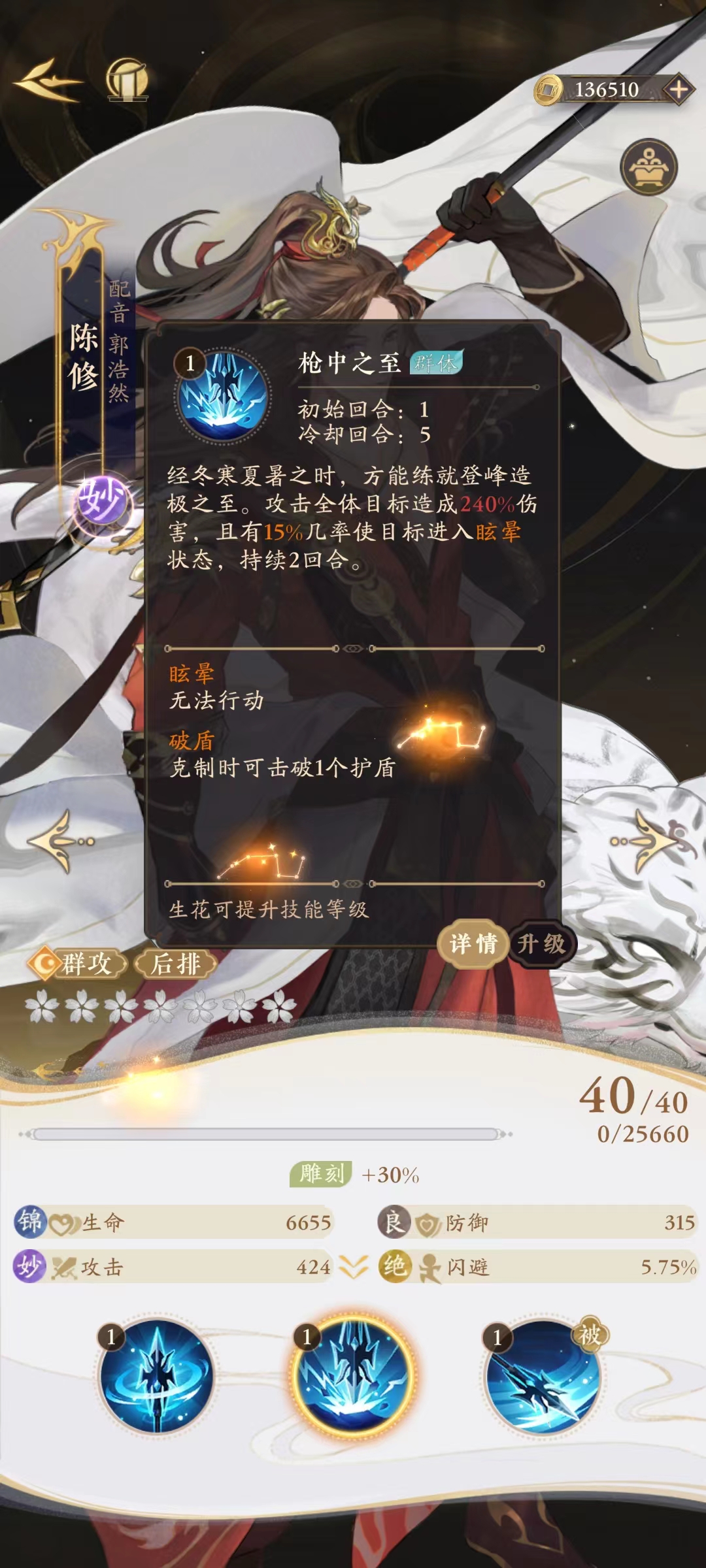 陈修经历了冬寒夏暑的磨砺,掌握了登峰造极的枪术。对全体目标发动攻击,造成240%的伤害,并且有15%的几率使目标进入眩晕状态,持续2回合,被眩晕的敌人将无法行动。这对于面对多个敌人或需要打乱敌人的行动顺序时非常有用。