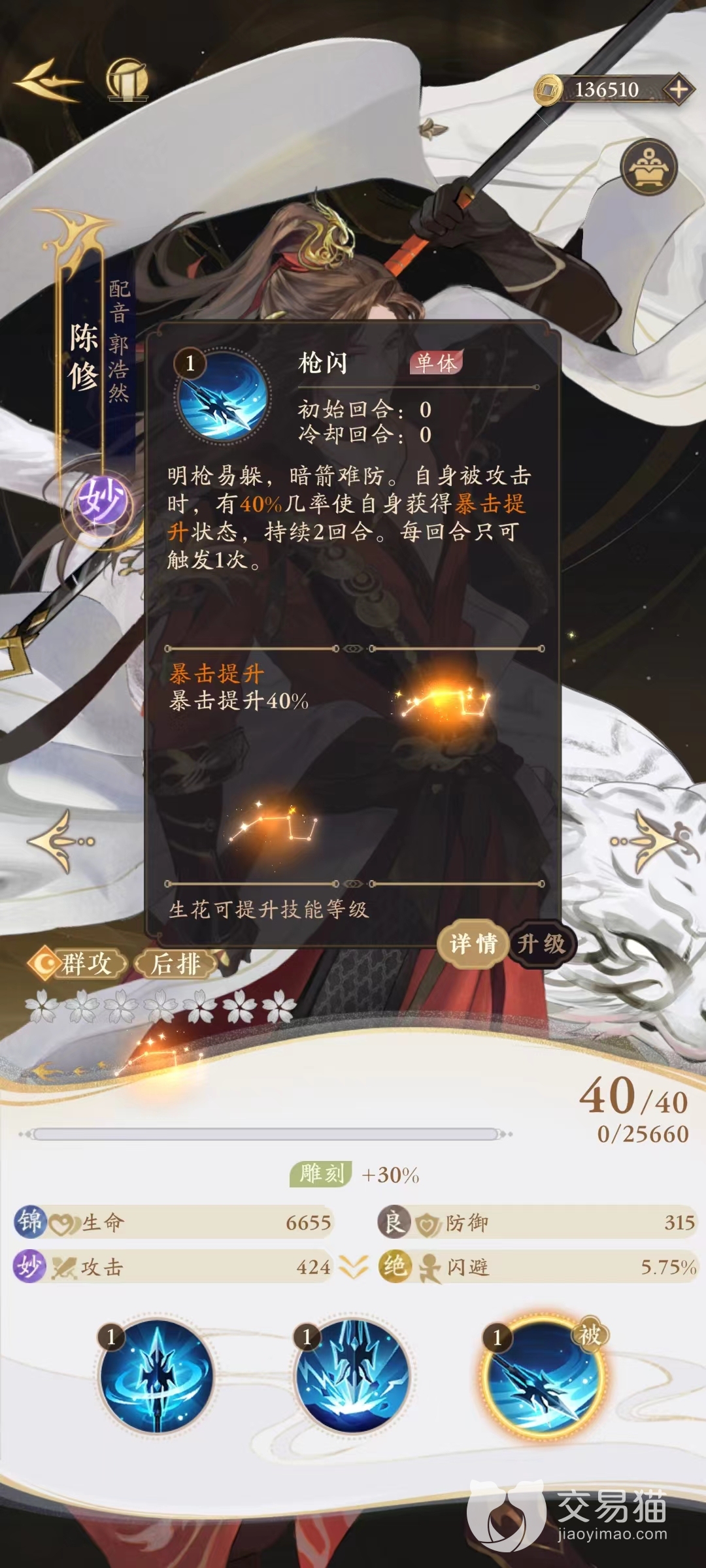 陈修懂得明枪易躲、暗箭难防的道理。当他受到攻击时,有40%的几率使自身获得暴击提升状态,提升40%的暴击,持续2回合。每回合只能触发1次。被动技能枪闪可以提升暴击率,增加她的输出能力。这对于增加她在战斗中的伤害输出非常有帮助。