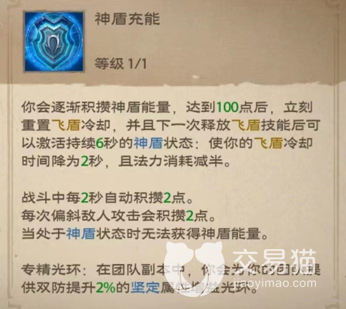 最后要了解的是守卫形态下的主要特点神盾充能,会逐渐积累神盾能量,达到100点时将飞盾技能冷却立即重置,并使下一次飞盾技能释放时激活神盾状态。在此状态下法力消耗降低,飞盾冷却时间下降,战斗过程中会自动积累能量,每次偏斜成功也会额外积累。