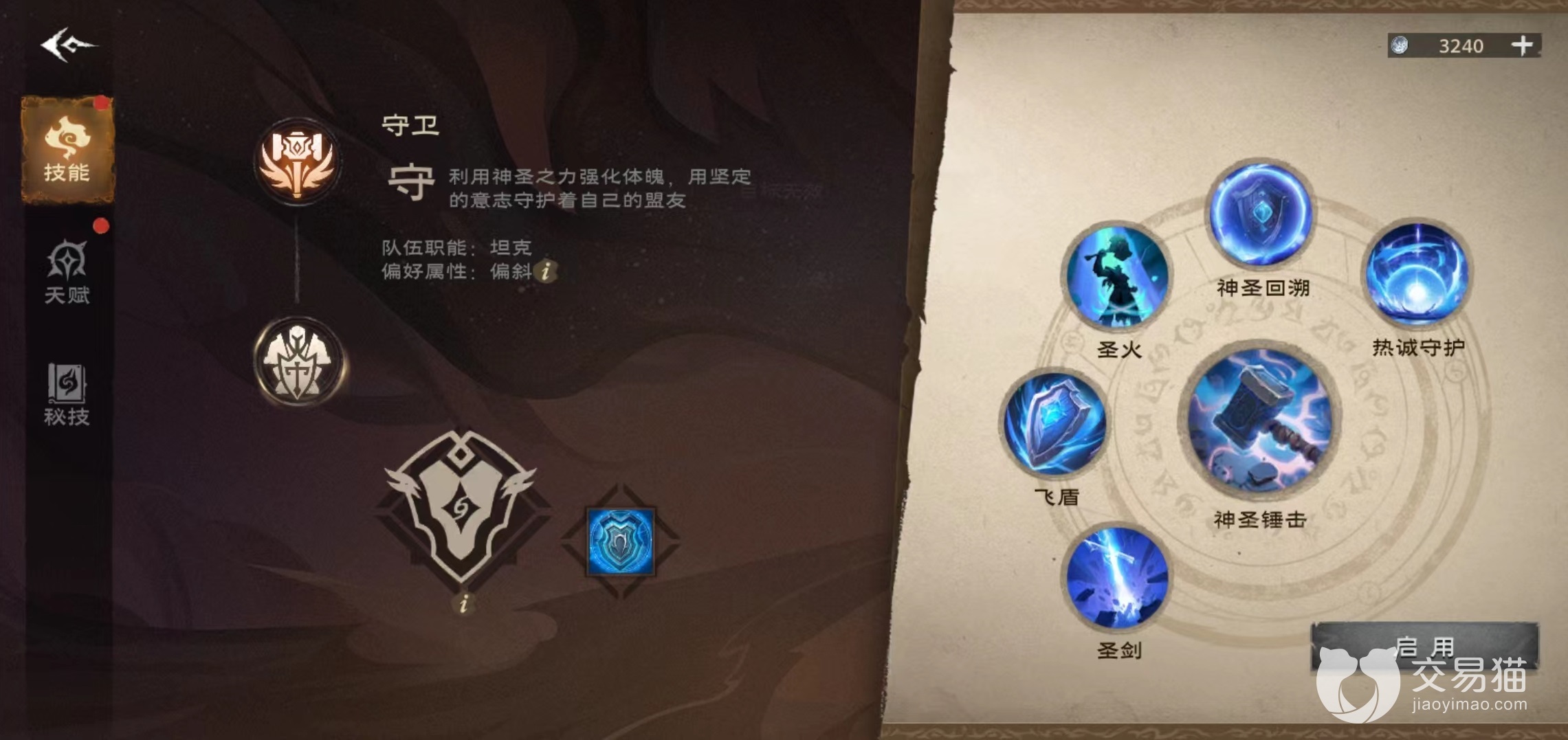 第2个技能神圣回溯,是一个可以加血的效果,能够恢复自身超过1/5血量,冷却时间90秒,在治疗跟不上节奏时自己加一口保住性命。第3个是技能飞盾,也是防骑最关键开怪技能,向目标投掷出神盾造成物理伤害后自身获得护盾,盾可以抵消受到的大量伤害。一般在开战时就直接使用,CD好了就再扔出去,为的就是护盾能够常驻在身上。其他技能还有圣火和圣剑,圣火是燃烧圣洁能量使周围敌人受到持续魔法伤害,圣剑则是审判目标造成魔法伤害,这两个可以用于拉仇恨。