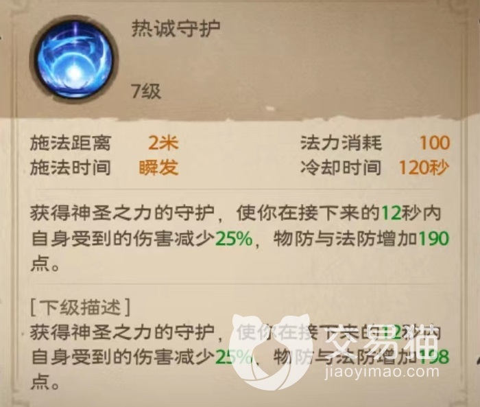 在此形态下最关键的就是开怪,并将boss仇恨牢牢吸引在自己身上,同时在战斗过程中要根据boss释放技能合理开启减伤。不能将所有希望都寄托在治疗身上,如果不开减伤根本加不上血,所以最关键技能必须要用好。首先是热诚守护,这是圣骑士非常关键技能,获得守护之力使接下来12秒内自身受到伤害大幅减少,物理防御和法术防御同时增加,冷却时间120秒,一定要在最关键时候开启。