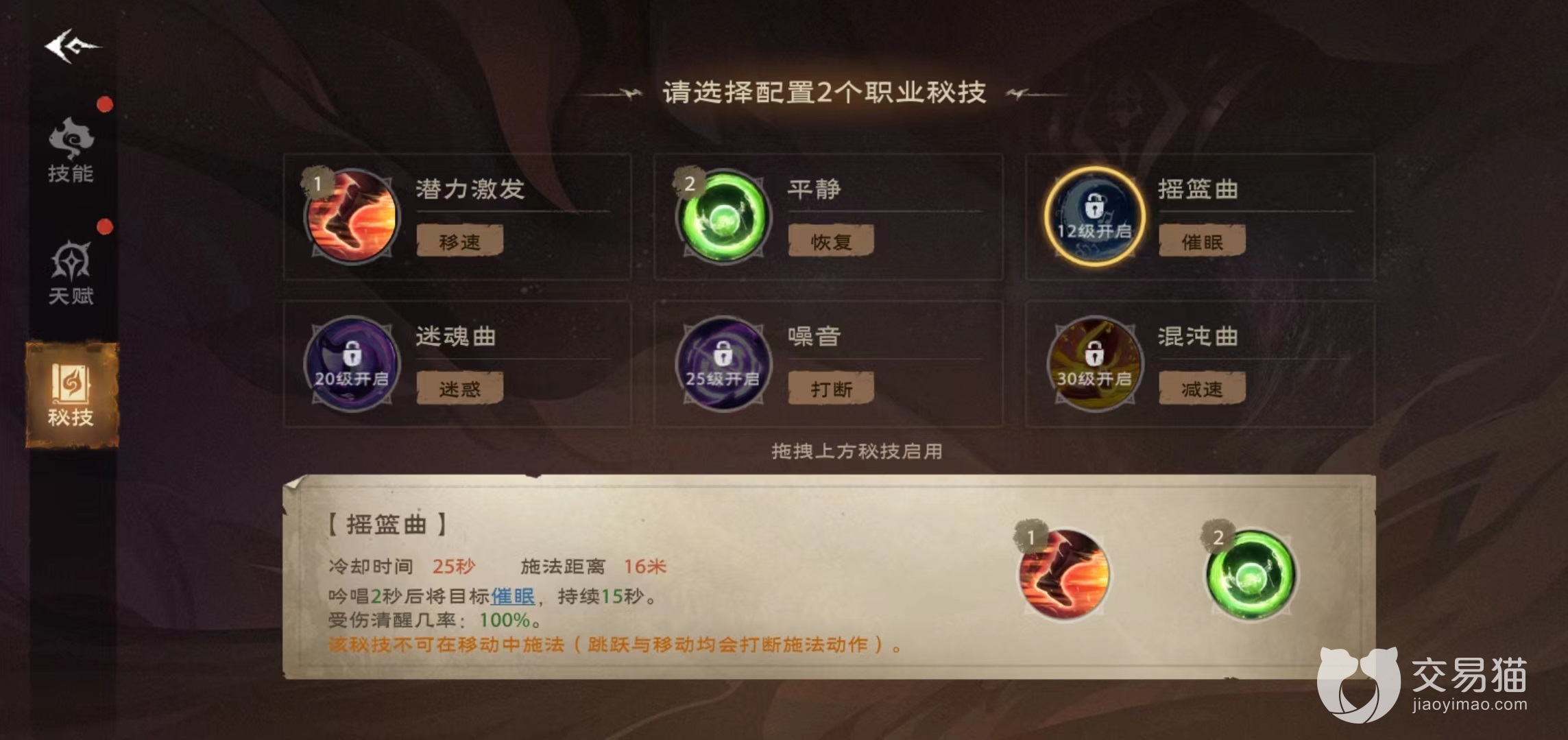 虽然该职业在竞技方面并不算突出,但是也要留下PK时秘技搭配,这样才能应对各种需要。小编推荐混沌曲和摇篮曲,摇篮曲使目标催眠,虽然受到伤害后会立即清醒,但是如果不去攻击,睡眠最多15秒。该技能需要引唱后释放,也可以通过天赋影响变成瞬发。对战开始时直接将对方催眠住,这样方便思考接下来战术或进行走位。混沌曲对目标造成减速效果,对于攻击近战对手来说非常关键,可以帮助拉开距离。