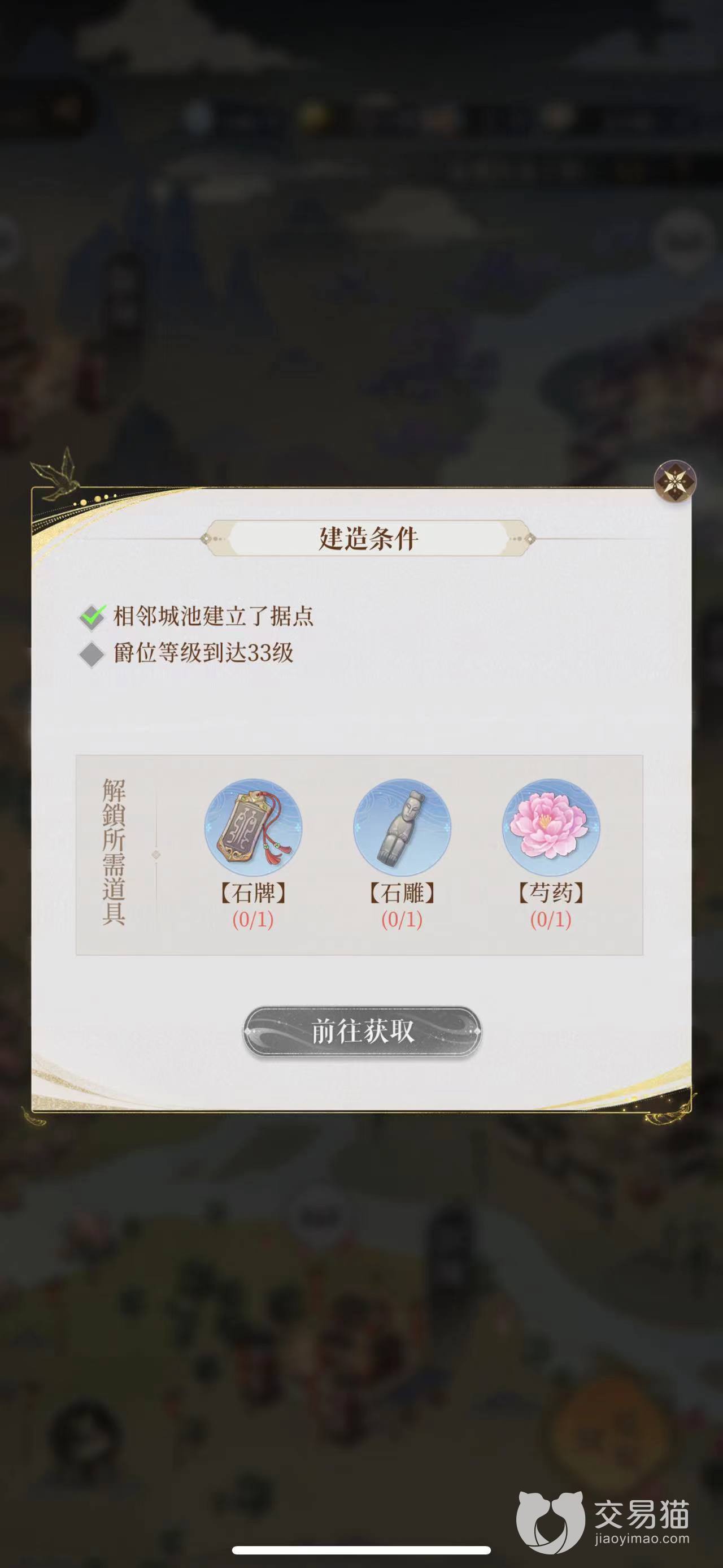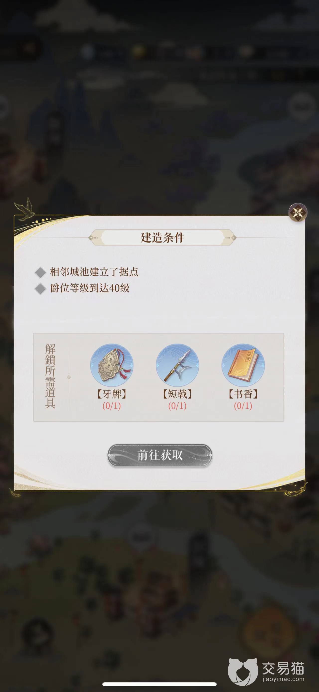 第二步需要获取【牙牌】【书香】【短戟】这三个物品,而且需要解锁相邻的城池,主角等级达到40级才可以解锁,而解锁丹阳的前提是必须先解锁东阳,同样的,需要在东阳获取三件物品【石牌】【石雕】【芍药】各一个,等级必须达到33级,所以这个丹阳据点的重建只能慢慢收集材料才可以获取到,而且等级要求也挺高的,现在正常玩家一般等级都带38级左右,玩家们可以通过每日历练来进行升级。