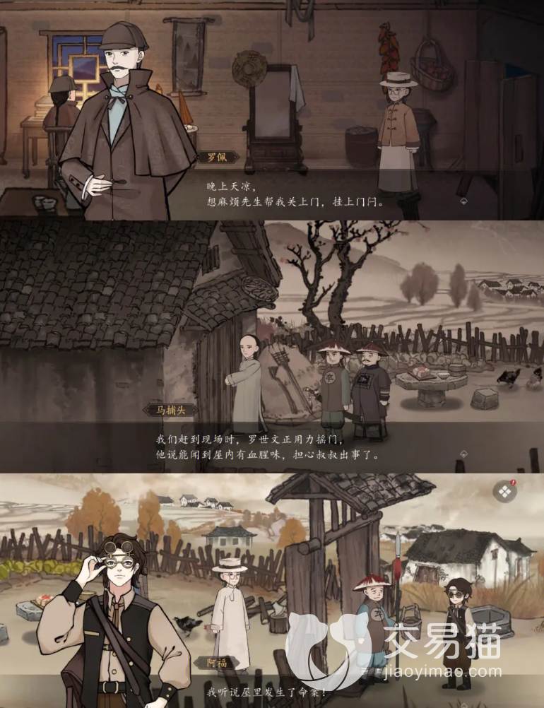 阿福在游戏中的作用可以用第一关来举例,第一关的故事发生在罗佩家里,罗佩是一个作家,他被发现死在了自己的衣柜里。沈仲平是第一个发现尸体的人,所以被当成了嫌疑犯。而阿福是沈仲平的助手,帮助我们推理案情。以下是他在第一关中做的事情: