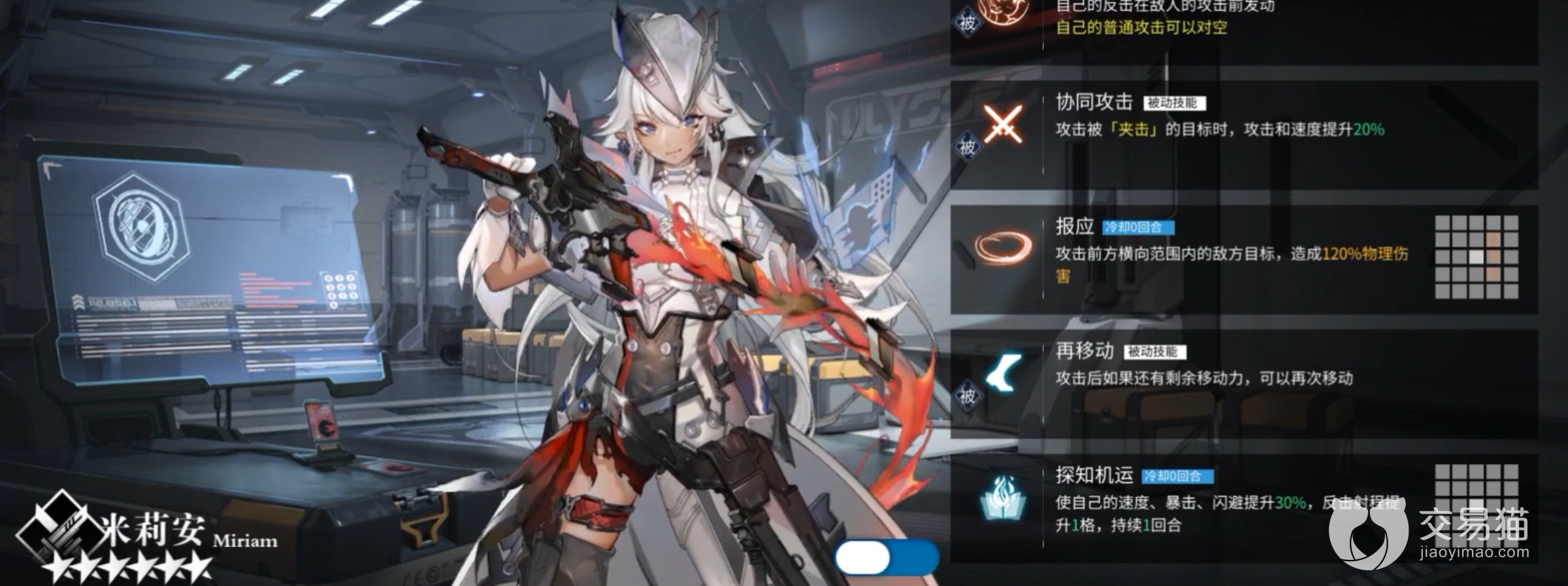 第一位推荐特勤是米莉安,这个特勤的职业是突击,攻击强度比较高,血也是比较厚的,她的技能一共有五个,基本上都是被动技能,唯二的一个主动技能是【探知机运】,一共可以使用三次,且不会有冷却时间,在释放完这一技能后,米莉安的速度、暴击、闪避等属性都能有所提升,还有反击射程都会有所增加,另外一个【报应】能够横向范围地攻击前方敌人,对他们造成120%的物理伤害,如果敌方的物理防御比较弱的话,基本上这一招能直接秒杀,剩下的技能是先兆预知、报应、协同攻击以及再移动,它们的效果就是用来提升米莉安所具备的一些属性的,或者是增加她的再移动次数。