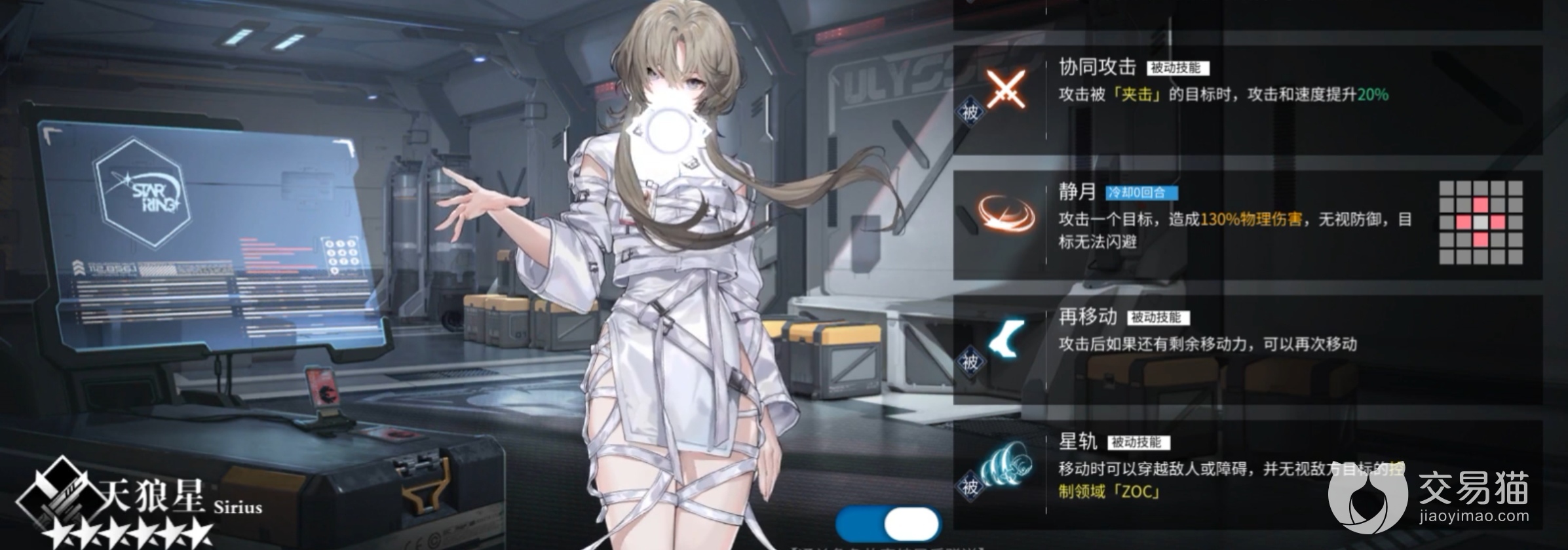 第二位推荐是天狼星,她的主动技能是【静月】,释放之后,可以无视敌方身上的防御,直接对其造成130%的物理伤害,同时敌方无法闪避这一伤害,真的很厉害的一招,命中率极其的高,每一招都能打到对方的身上,其它的几个技能效果还蛮多样化的,【死星】在触发后,可以多次触发,并且能够让天狼星专注于攻击敌方生命低的目标,而【星轨】触发之后,能够让天狼星移动过程中直接无视敌方的控制领域,穿越那些障碍物。剩下两个技能的效果就比较普通,没用什么特别的。