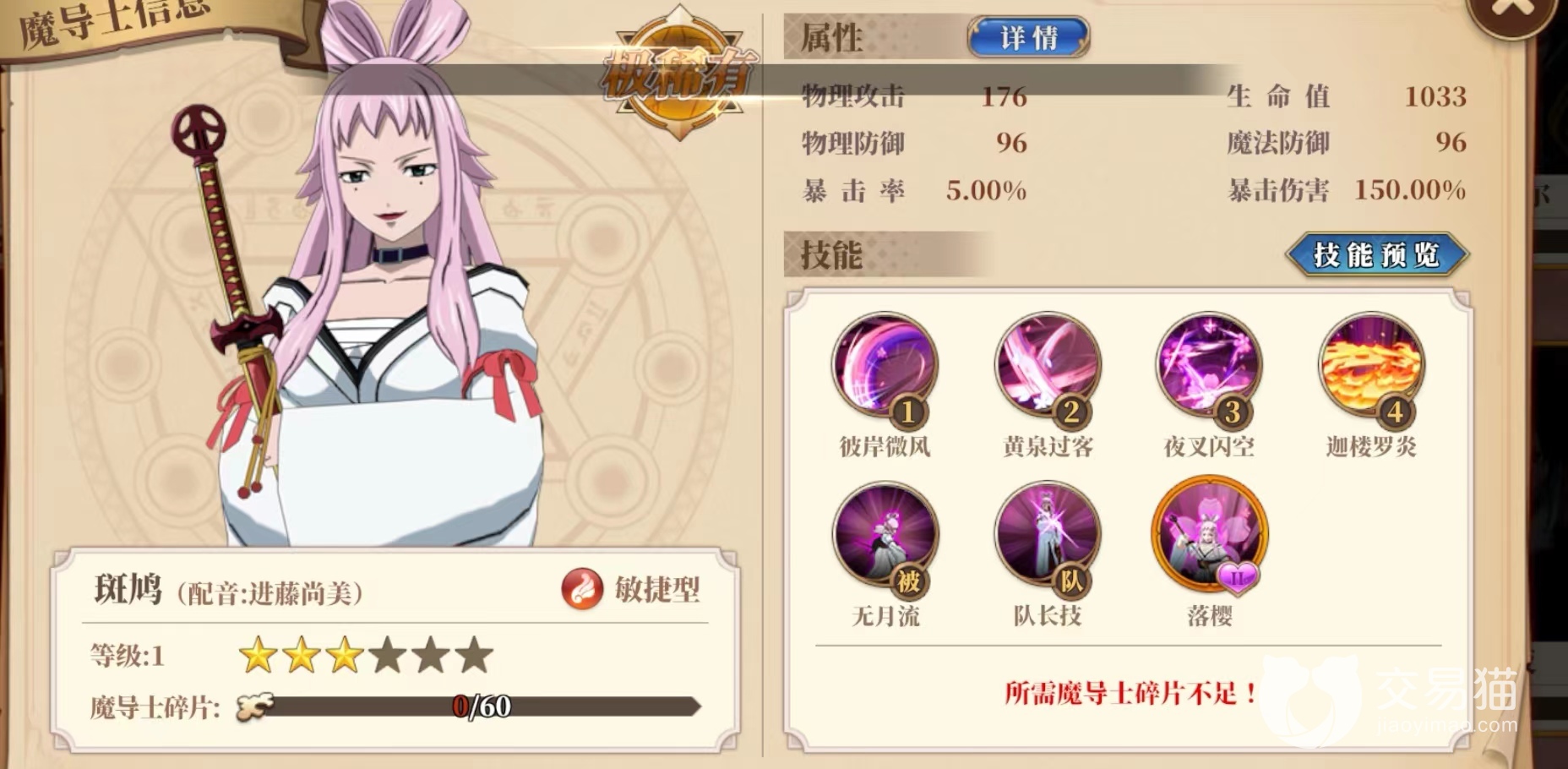 斑鸠是妖精的尾巴激斗游戏中的一个角色,初始就是极稀有度的角色,她还加入了游戏第一期角色UP池,强度自然不会弱,加上她的造型也有很多玩家愿意话钻石去抽她,接下来给大家讲讲妖精的尾巴激斗斑鸠技能强度怎么样。她是一个风属性角色,前期送的角色露西的强度不太行,可以考虑抽个斑鸠来打风属性破盾。
