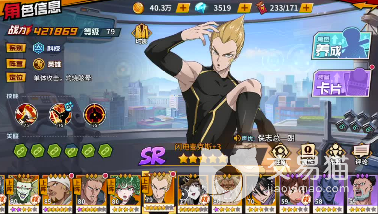 埼玉,是游戏中最具有代表性的一个角色。他是一个非常直爽的光头男,战斗时拥有很强悍的战斗力,使用的都是一些操作简单实力强悍的技能。但面对boss的时候,能够发挥出强大的实力,很适合新手。