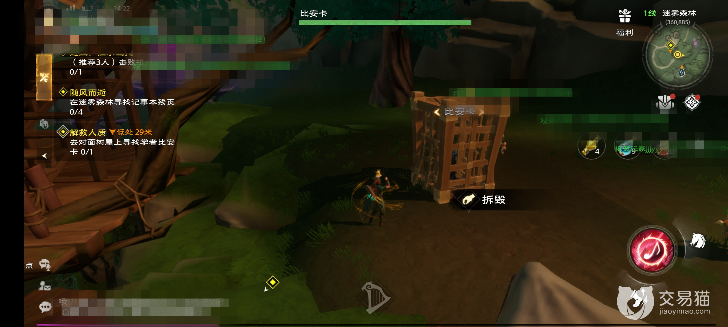 其实任务NPC真正的位置需要先登上描述中“对面树屋”,然后通过大树的分支走到一个平台之上,这个所谓的NPC就在被关在一个笼子里(更增加了寻找的难度)。只要点击牢笼就能放出NPC,然后进行对话就能完成这个任务。
