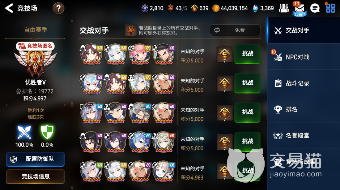 3、系统玩家:如果大家平常对竞技场不是很热衷或者是不太会打的话,那么可以去和系统里的NFC切磋战斗,获胜的话也是可以取得积分的。