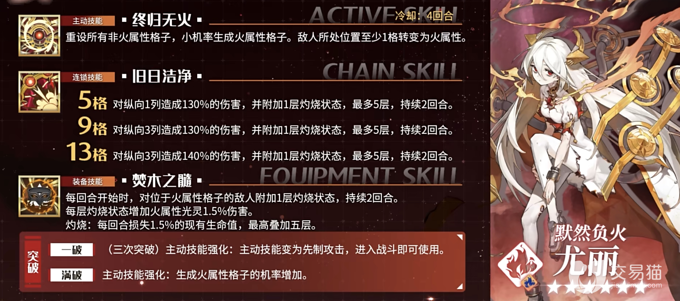 尤丽的主动技能【终归于火】会重设所有地图中非火属性的格子,小概率生成火属性格子。敌方单位所处位置至少一个格子会被这一技能转变为火属性。连锁技能【旧日洁净】在连锁五格时会对纵向一列的所有敌方单位造成130%的伤害,并对其附加一层灼烧状态,该效果至多叠加五层,持续两回合;连锁九格时技能伤害不改变,技能范围从纵向一列变化为纵向三列;连锁十三格时技能范围为纵向三列,伤害倍率为140%。